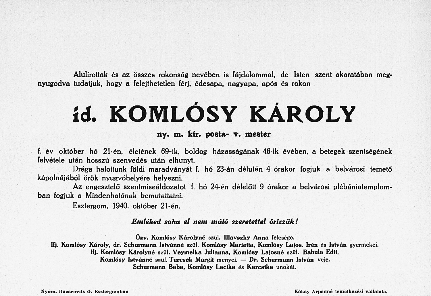Komlósy Károly gyászjelentése1940-10-21Komlósy(Chundár) Károly 1871 X159
