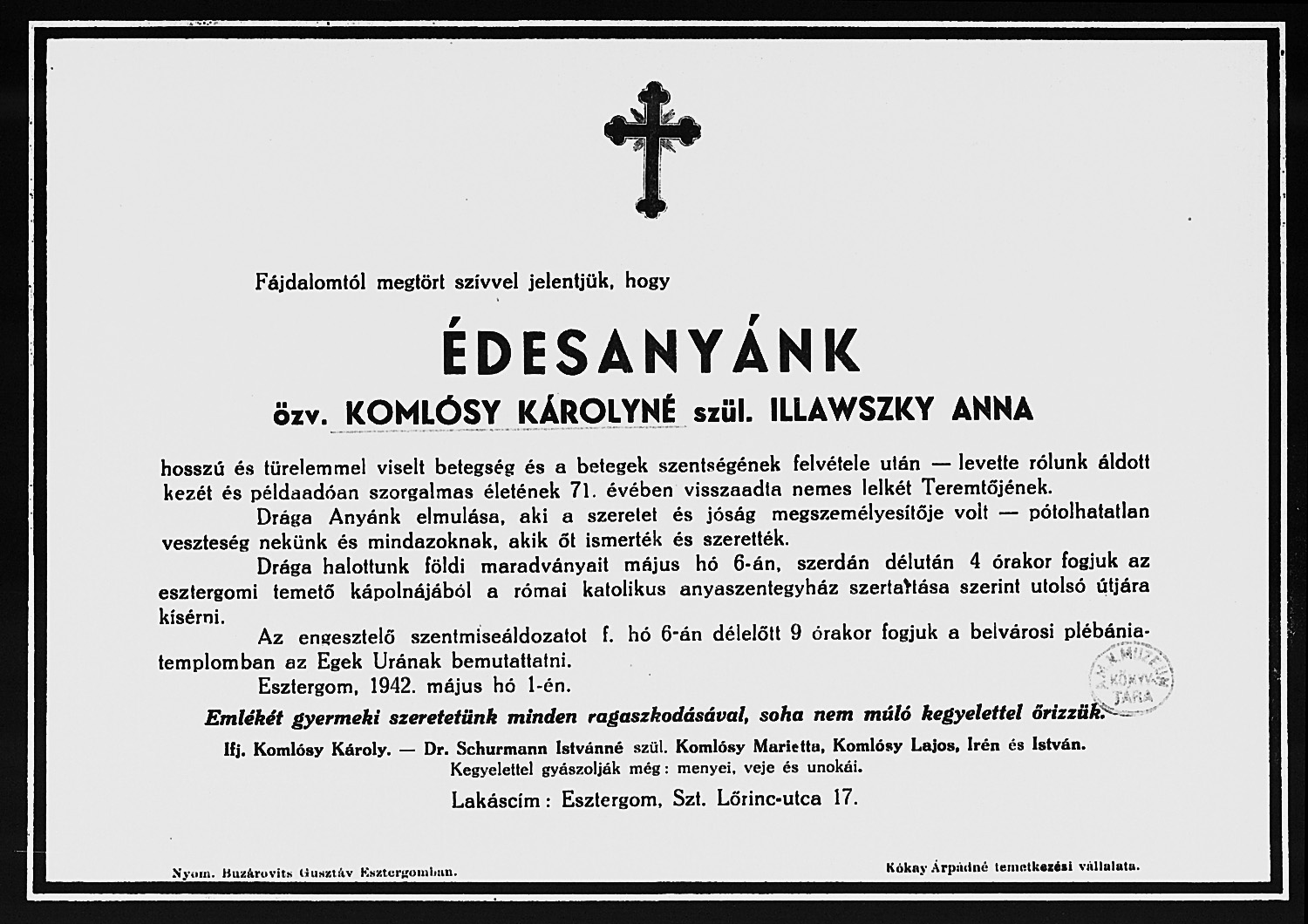 Komlósy Károlyné Illawszky Anna gyászjelentése1942-05-01Komlósy(Chundár) Károly 1871 X159
