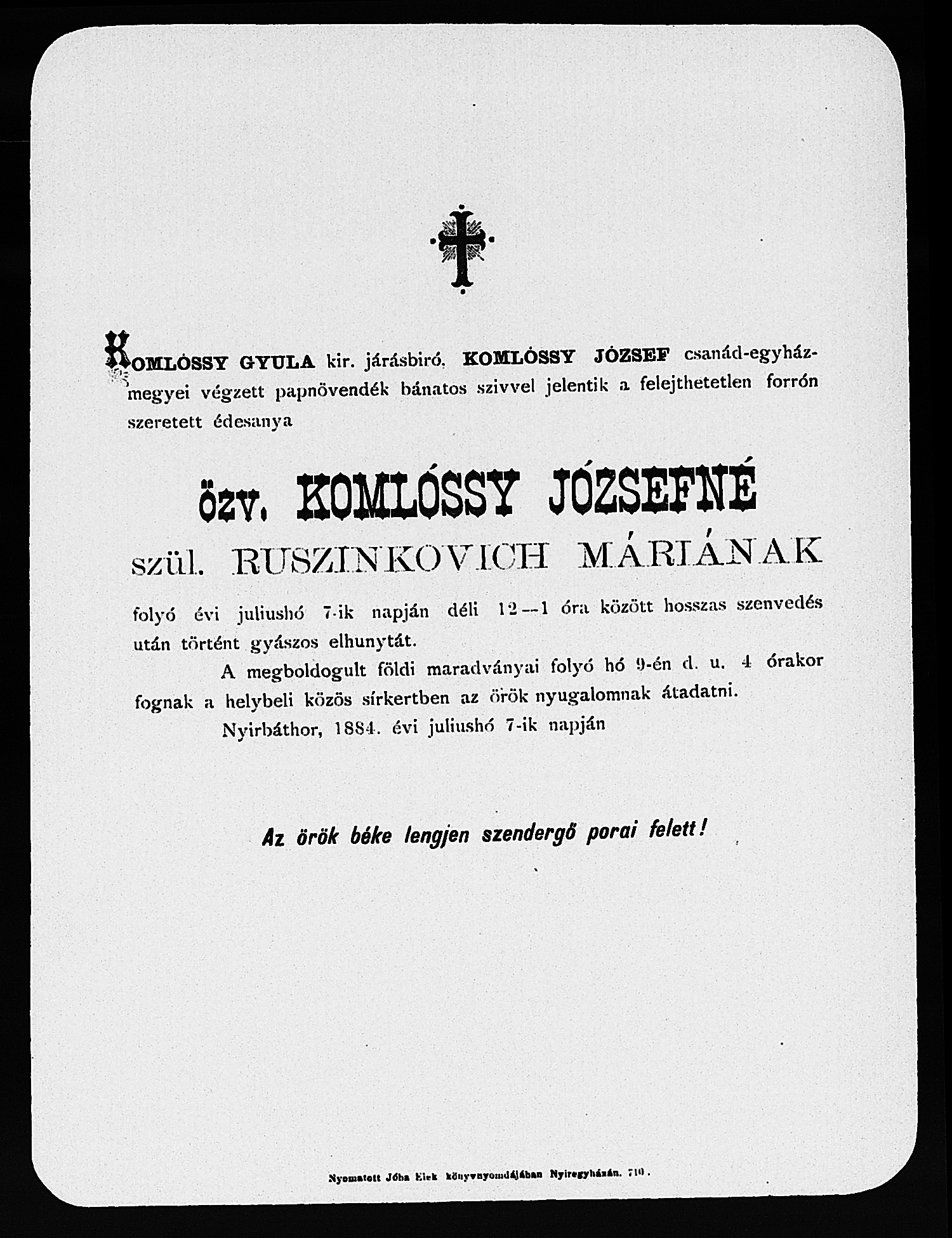 özv. Komlóssy Józsefné Ruszinkovich Mária gyászjelentése1884-07-07Komlóssy József ~1820 X046