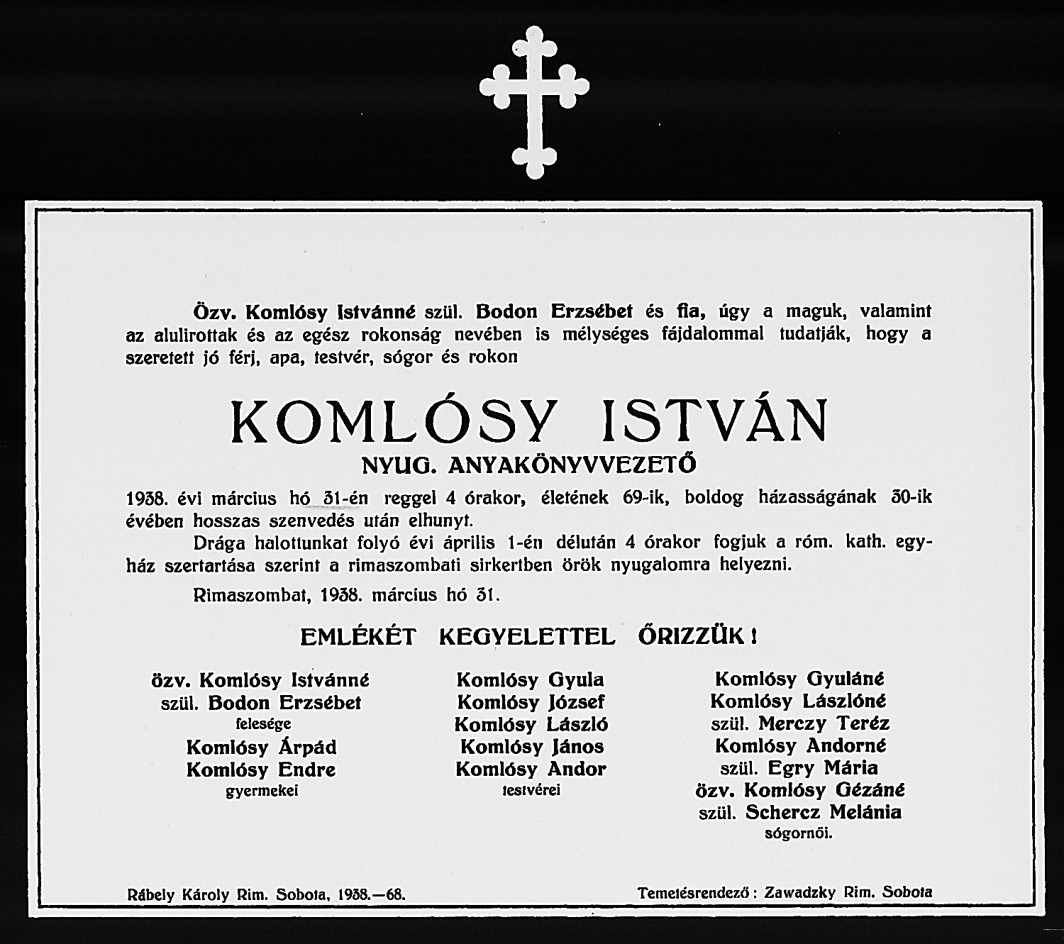 Komlósy István rimaszombati anyakönyvvezető gyászjelentése1938-03-31Komlósy(Komlós) István 1869 X049