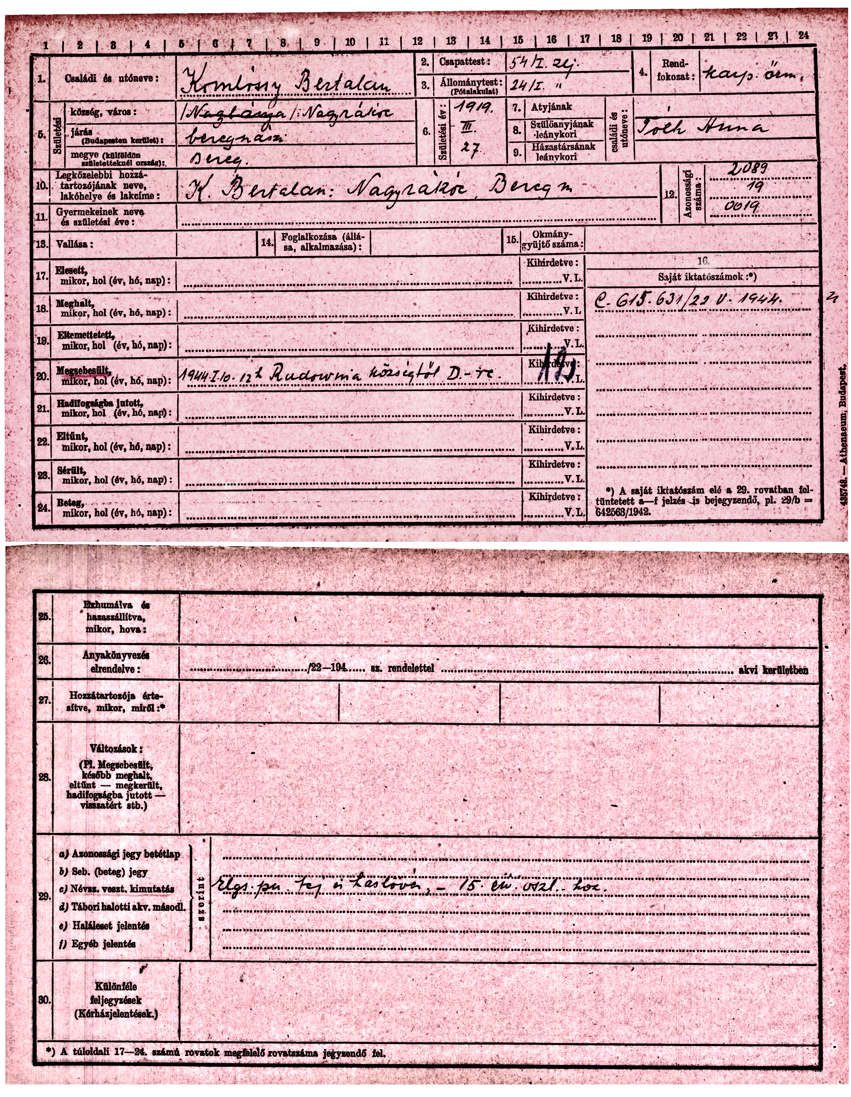 Bertalan katonai nyilvántartó lapjaKomlósy Bertalan 1919 F050