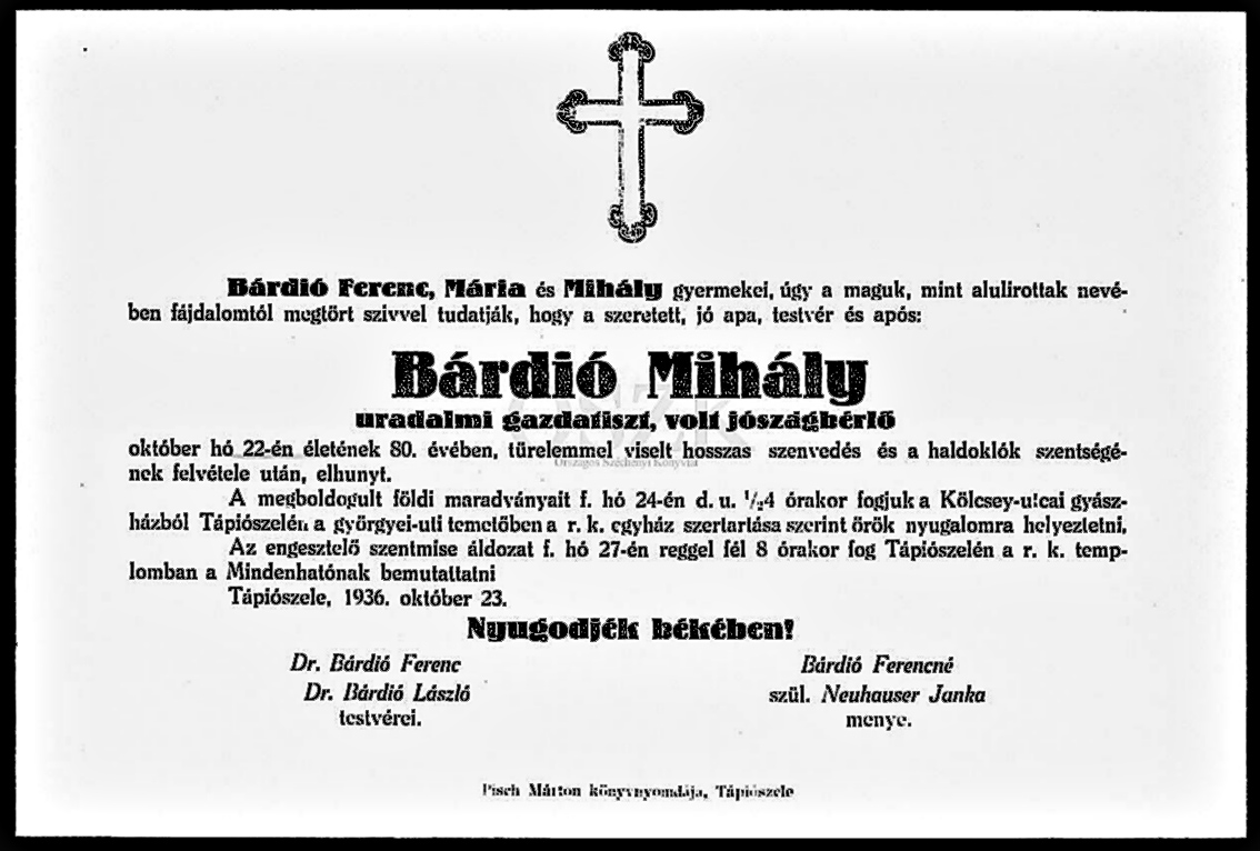 Bárdió Mihály gyászjelentése1936-10-22Komlóssy Jolán 1866 X120