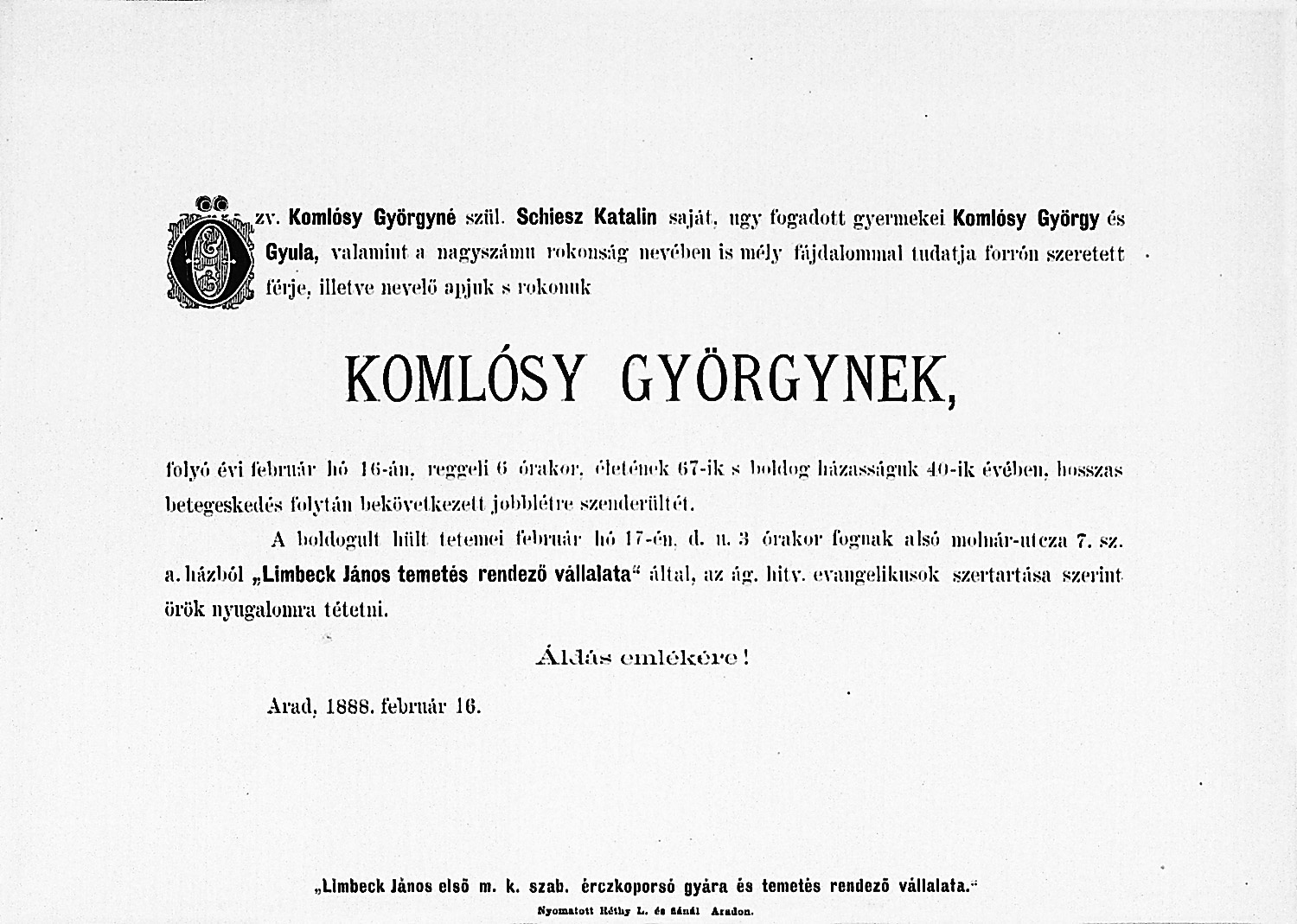 Komlósy(Komár) György gyászjelentése1888-02-16Komlósy(Komár) György ~1821 X124