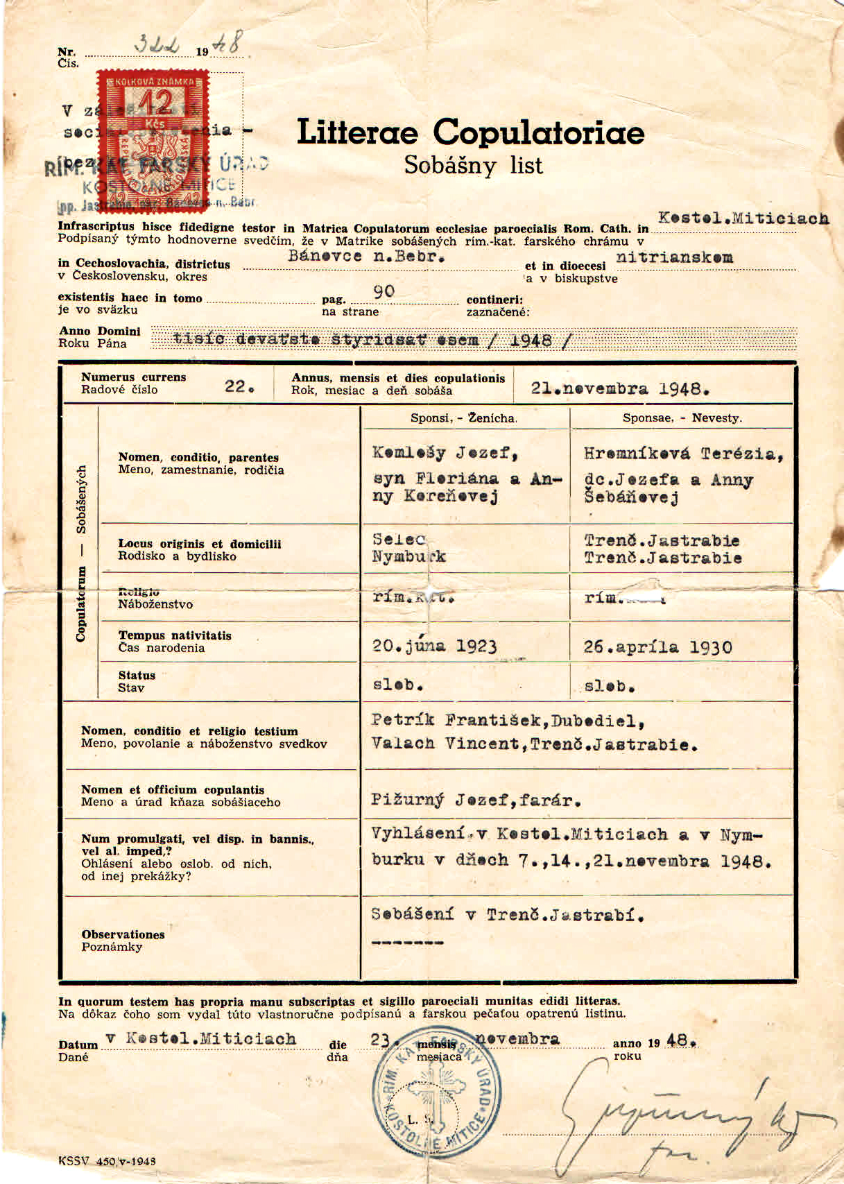 Komlosy József és Hromnik Teréz házasságlevele1948-11-23Komlosy József 1923 K035