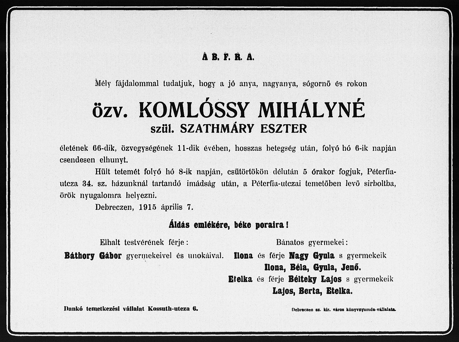 özv. Komlóssy Mihályné Szathmáry Eszter gyászjelentése1915-04-06Komlóssy Mihály ~1845 U014