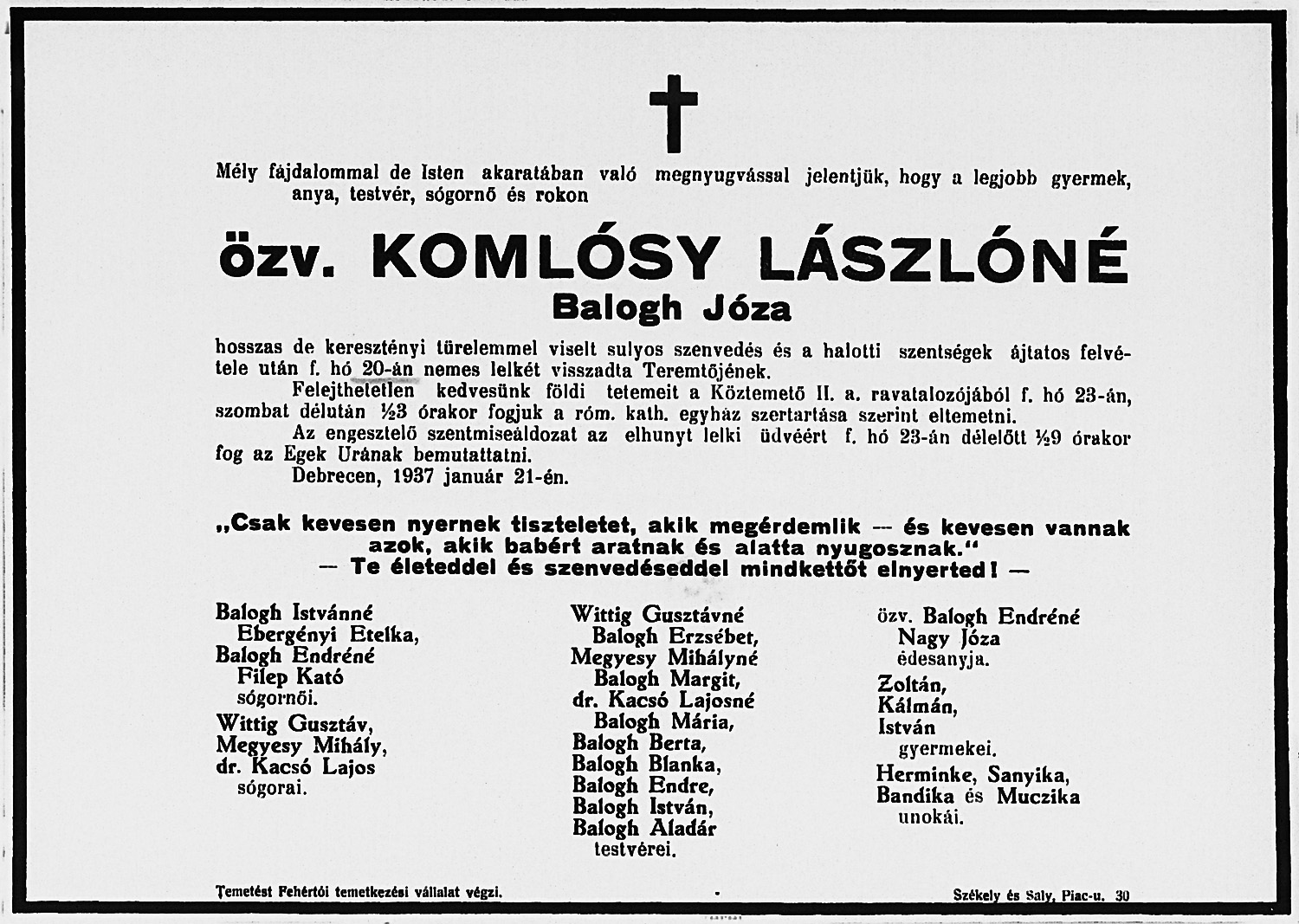 özv. Komlósy Lászlóné Balogh Józa gyászjelentése1937-01-20Komlósy László ~1875 U038