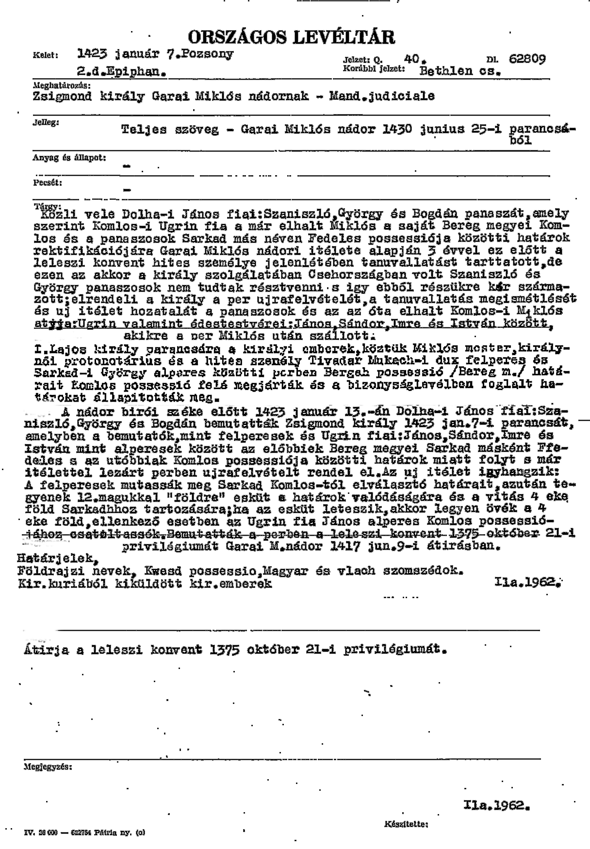 Komlós és Sarkad határ per anyaga1423-01-07Komlósi Miklós ~1382 A006