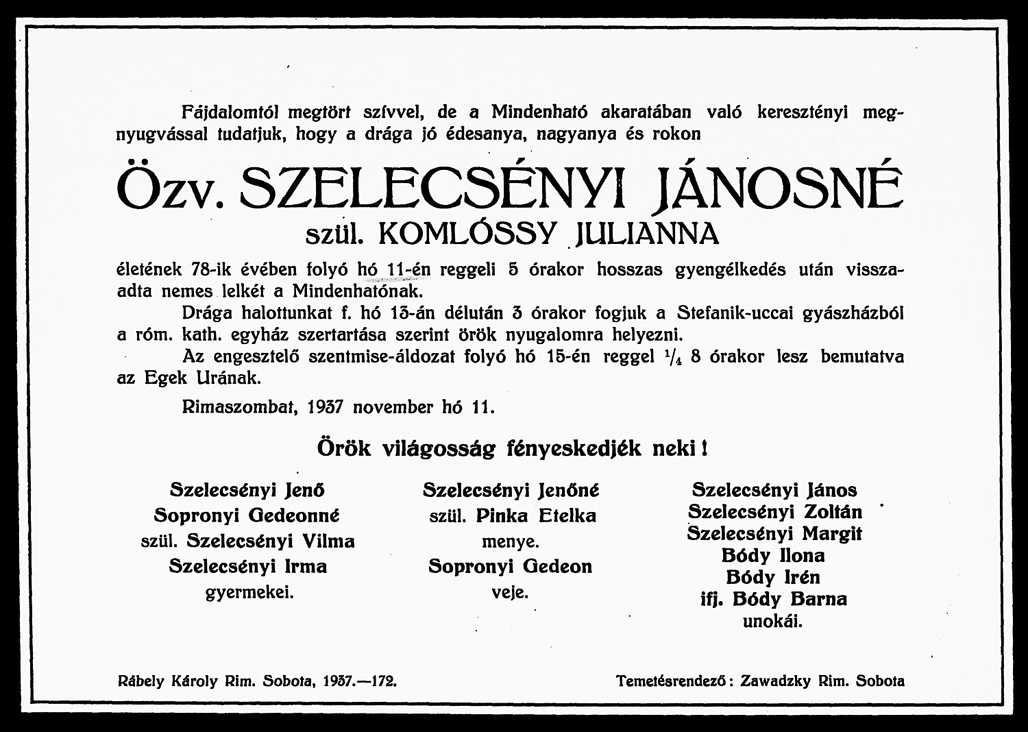 Komlóssy Julianna özv. Szelecsényi Jánosné gyászjelentése1937-11-11Komlóssy Júlia 1850 X192