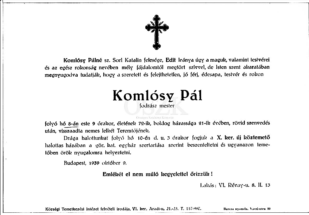 Komlósy Pál gyászjelentése1939-10-08Komlósy(Klitus) Pál 1868 X264