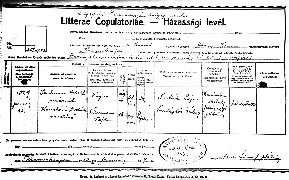 Borbála és Szakady Adolf házasságkötése1869-01-25Komlóssy Borbála 1842 X285