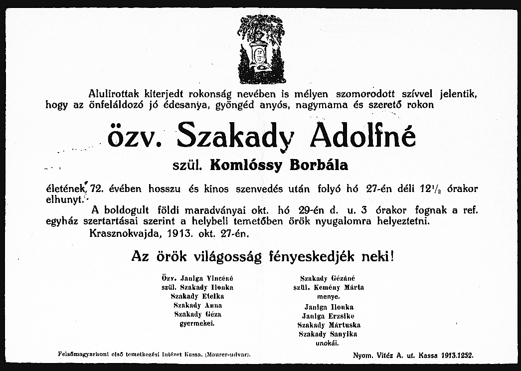 Komlóssy Borbála özv. Szakady Adolfné gyászjelentése1913-10-27Komlóssy Borbála 1842 X285