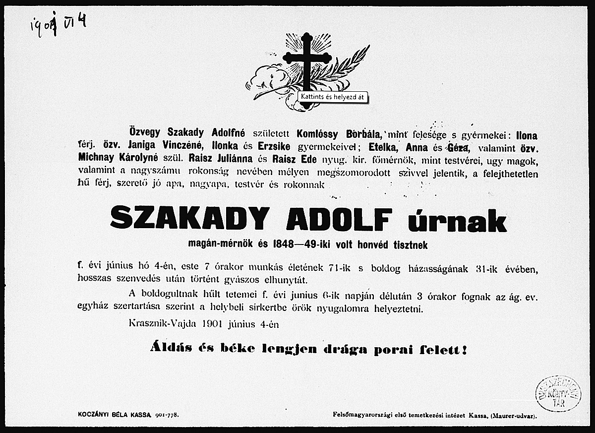 Szakady Adolf gyászjelentése1901-06-04Komlóssy Borbála 1842 X285