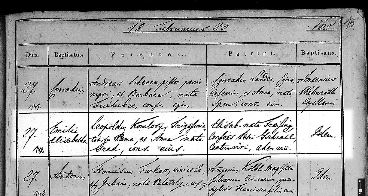 Komlósy Emilia-Erzsébet születési anyakönyvi bejegyzése1823-02-27Komlósy Emilia-Erzsébet 1823 X293