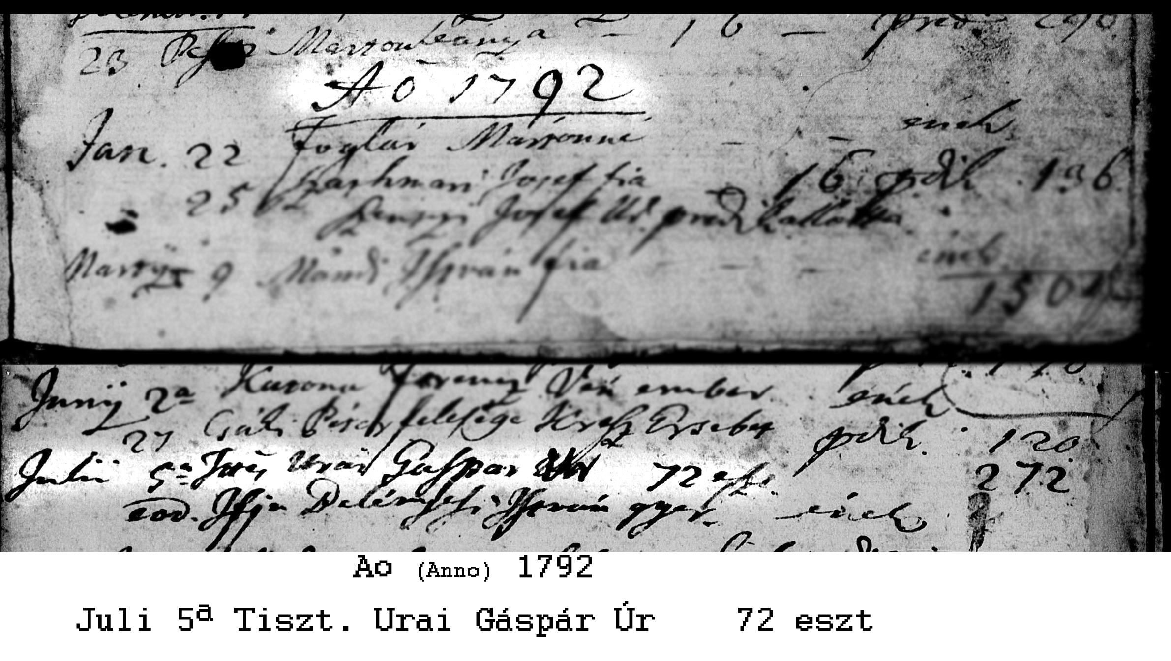 Uray Gáspár csengeri ref. lelkész temetési anyakönyvi bejegyzése1792-07-05Komlóssy Erzsébet 1732 X304