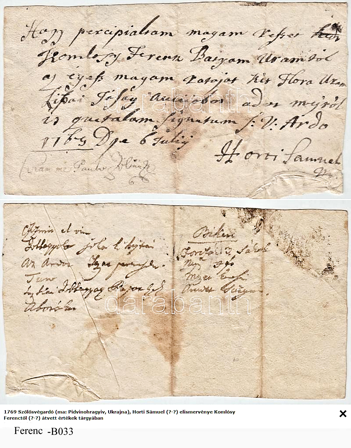 Horti(Horthy) Sámuel elismervénye tartozásáról1769-07-06Komlósy Ferenc ~1730 B033
