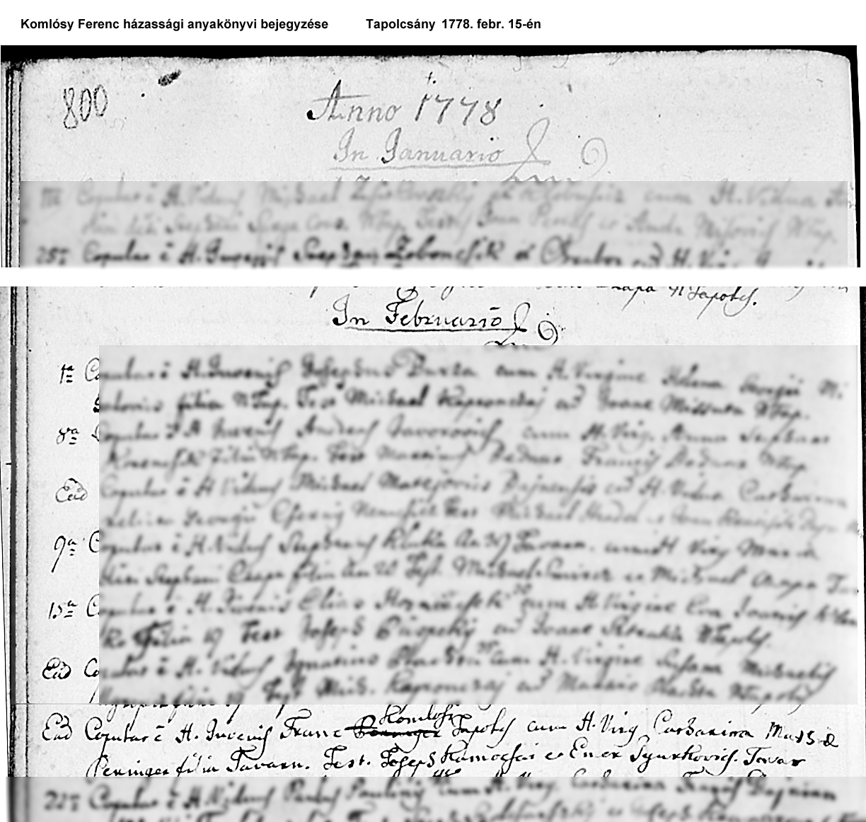 Komlósy Ferenc, a tapolcsányiak első ismert személyének házassági anyakönyve1778-03-15Komlósy Ferenc ~1755 K027
