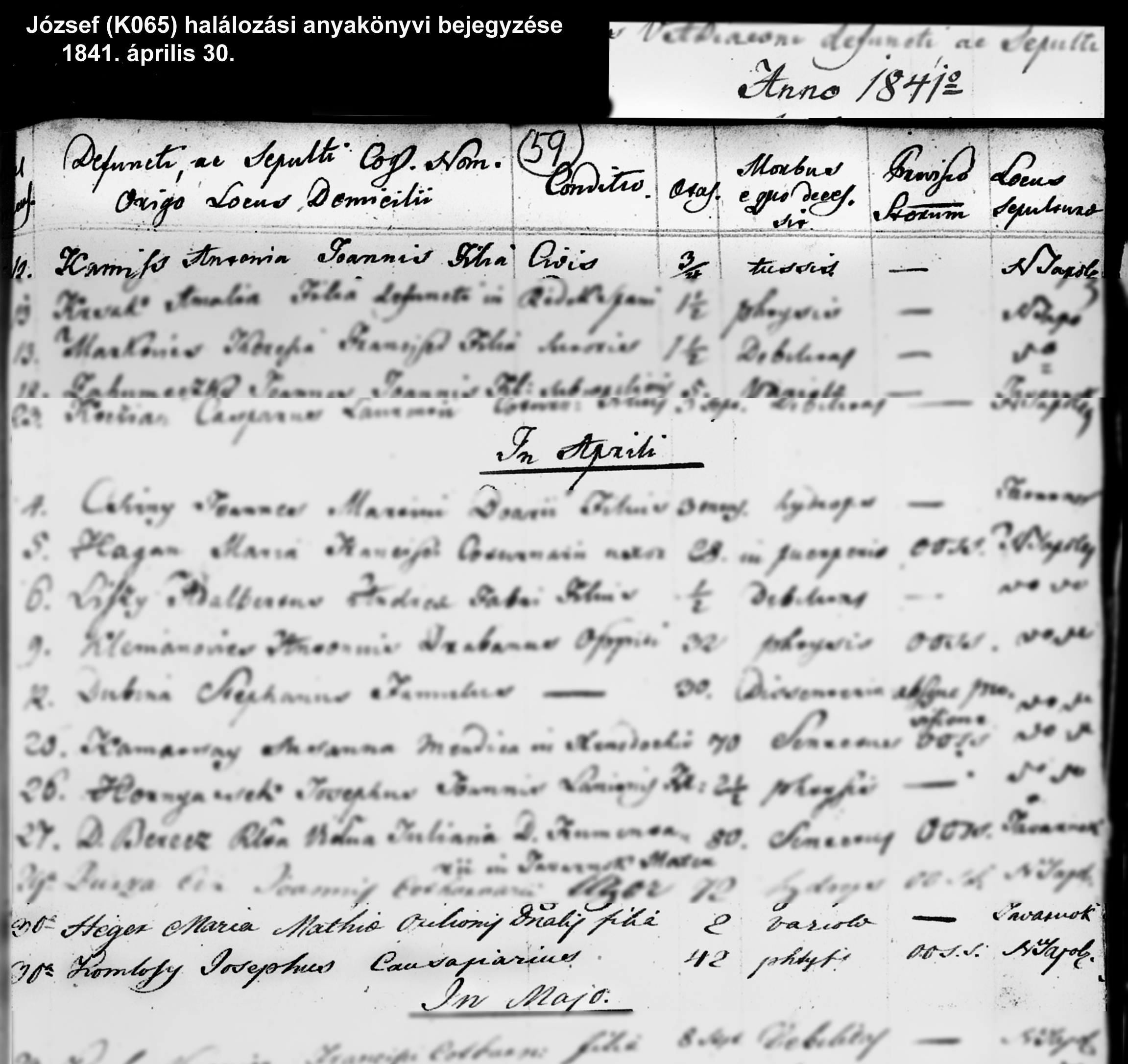 Komlósy József halálozási anyakönyvi bejegyzése1841-04-30Komlósy József 1796 K065
