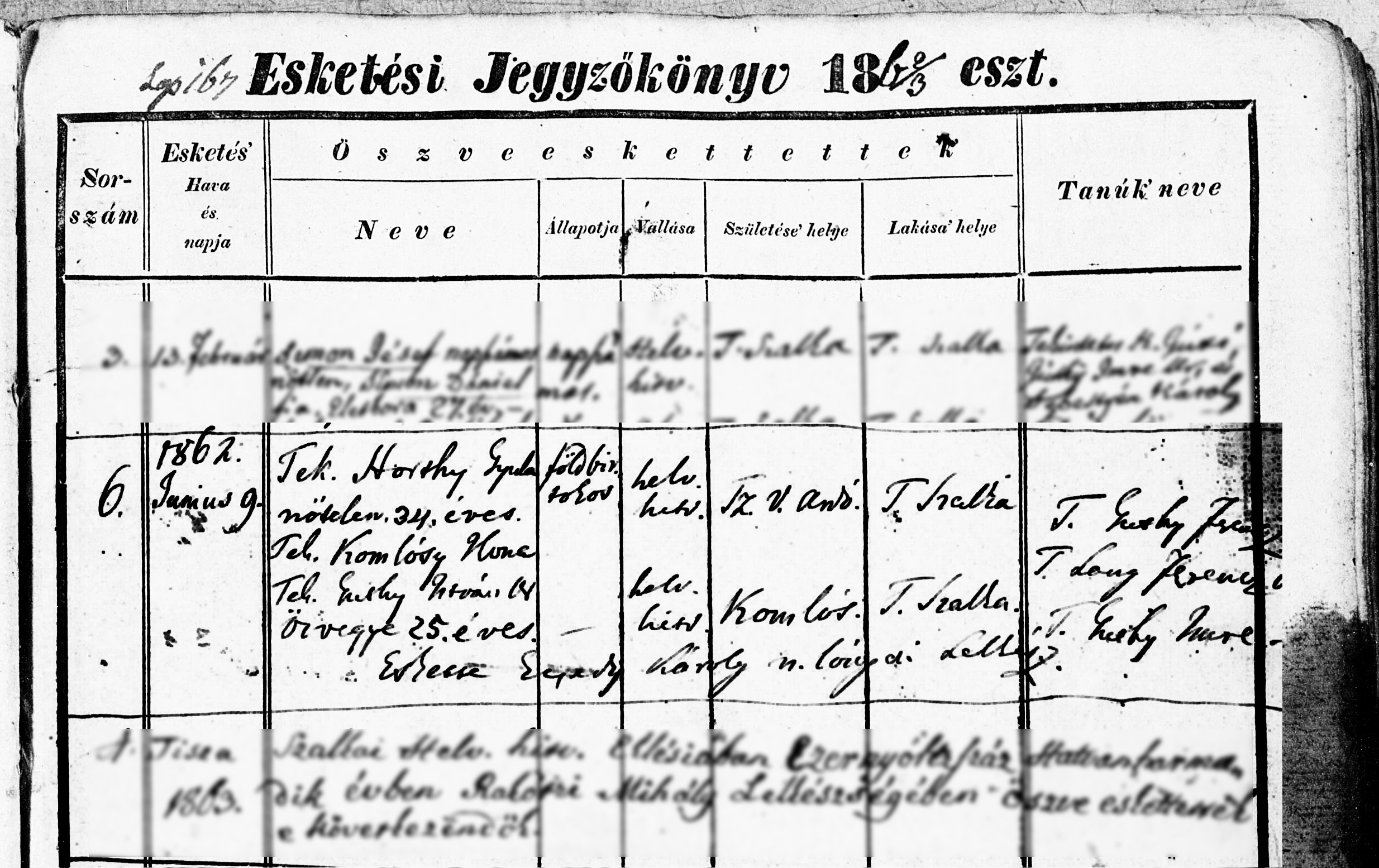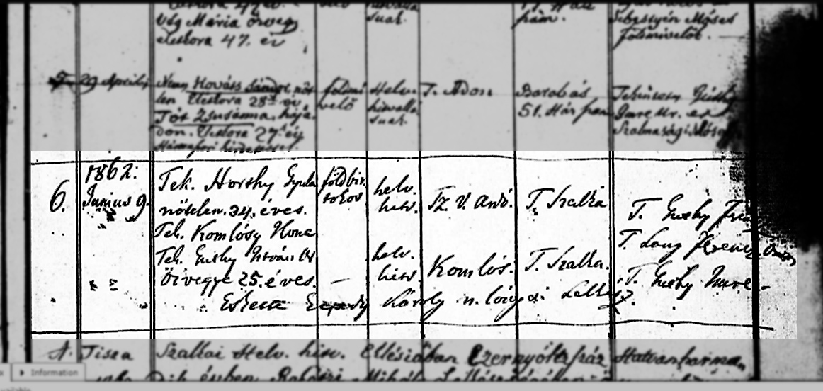 Ilona/Helén és Horthy Gyula házasságkötése a tiszaszalkai ref. templomban1862-06-09Komlósy Ilona/Helén 1836 E013