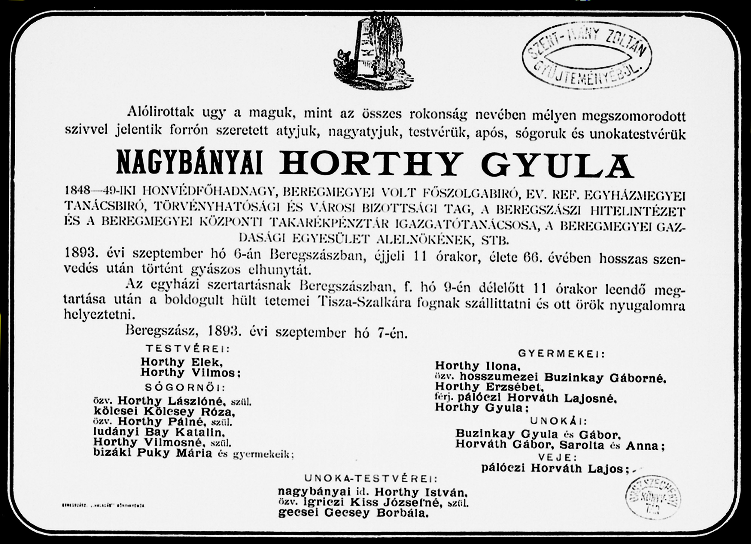 Horthy Gyula gyászjelentése1893-09-06Komlósy Ilona/Helén 1836 E013