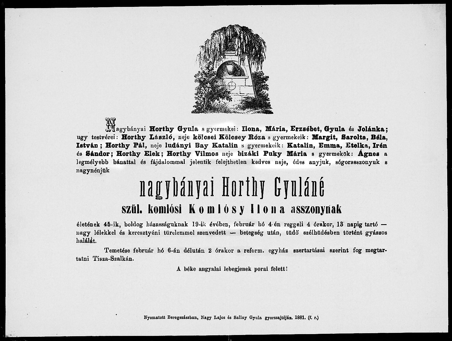 Komlóssy Ilona Horthy Gyuláné gyászjelentése1881-02-04Komlósy Ilona/Helén 1836 E013