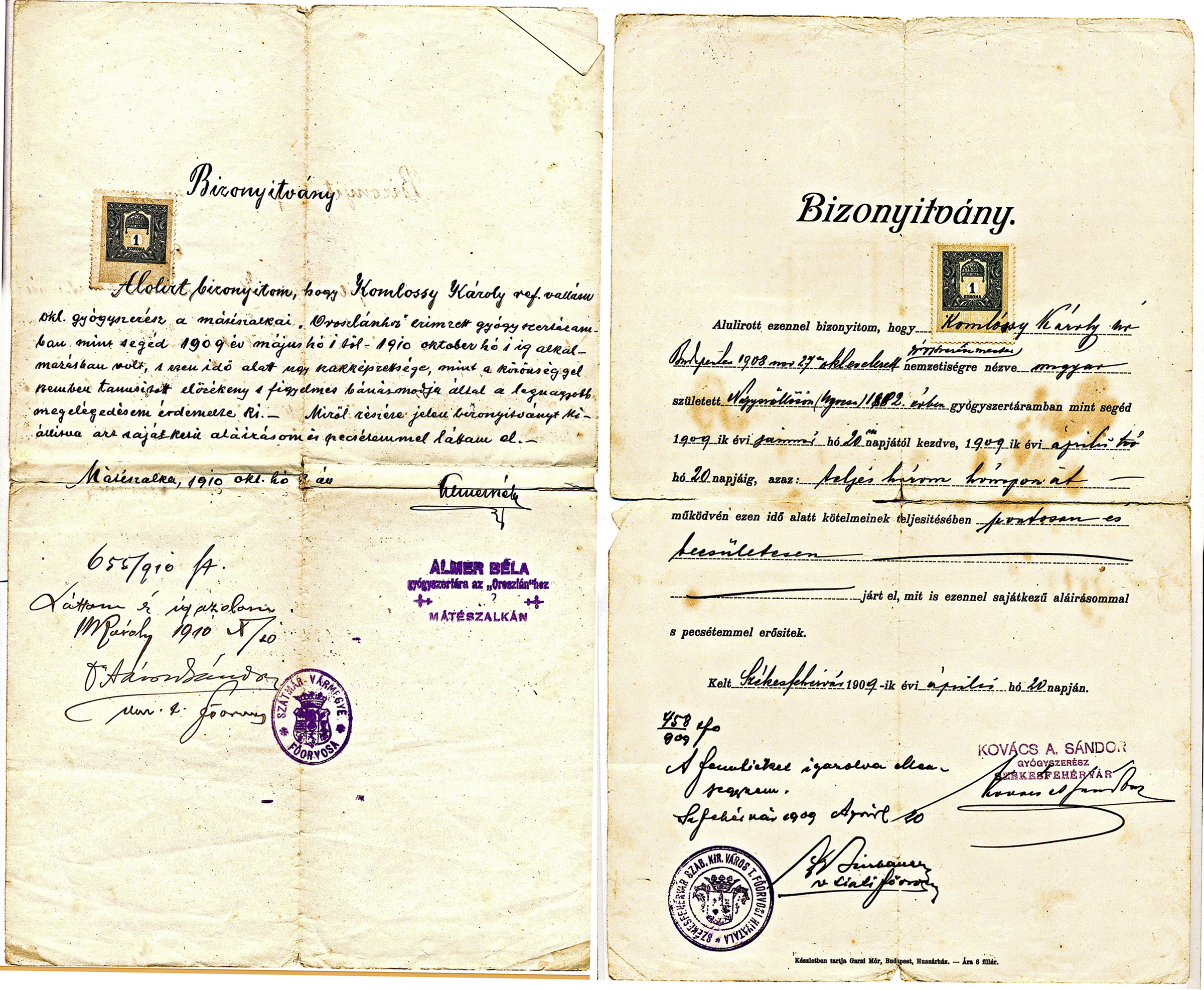 Komlósy Károly gyógyszerész referenciabizonyítványai1902-09-08Komlóssy Károly 1882 E016
