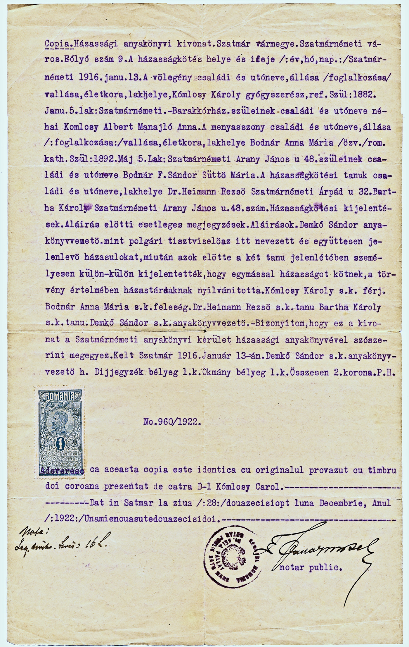 Komlósy Károly és Bodnár Anna házassági anyakönyvi bejegyzés1916-01-13Komlóssy Károly 1882 E016