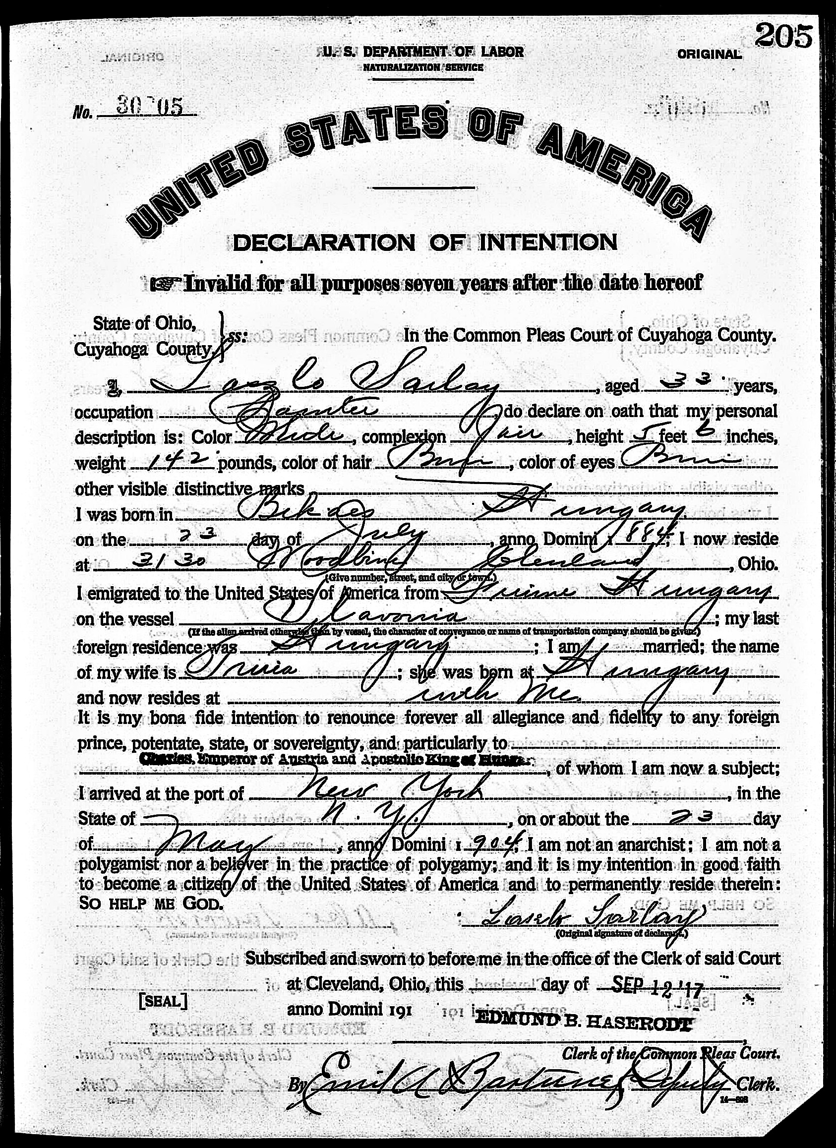 Sarlay László USA honosítási okirata1917Komlóssy Irma 1885 E017