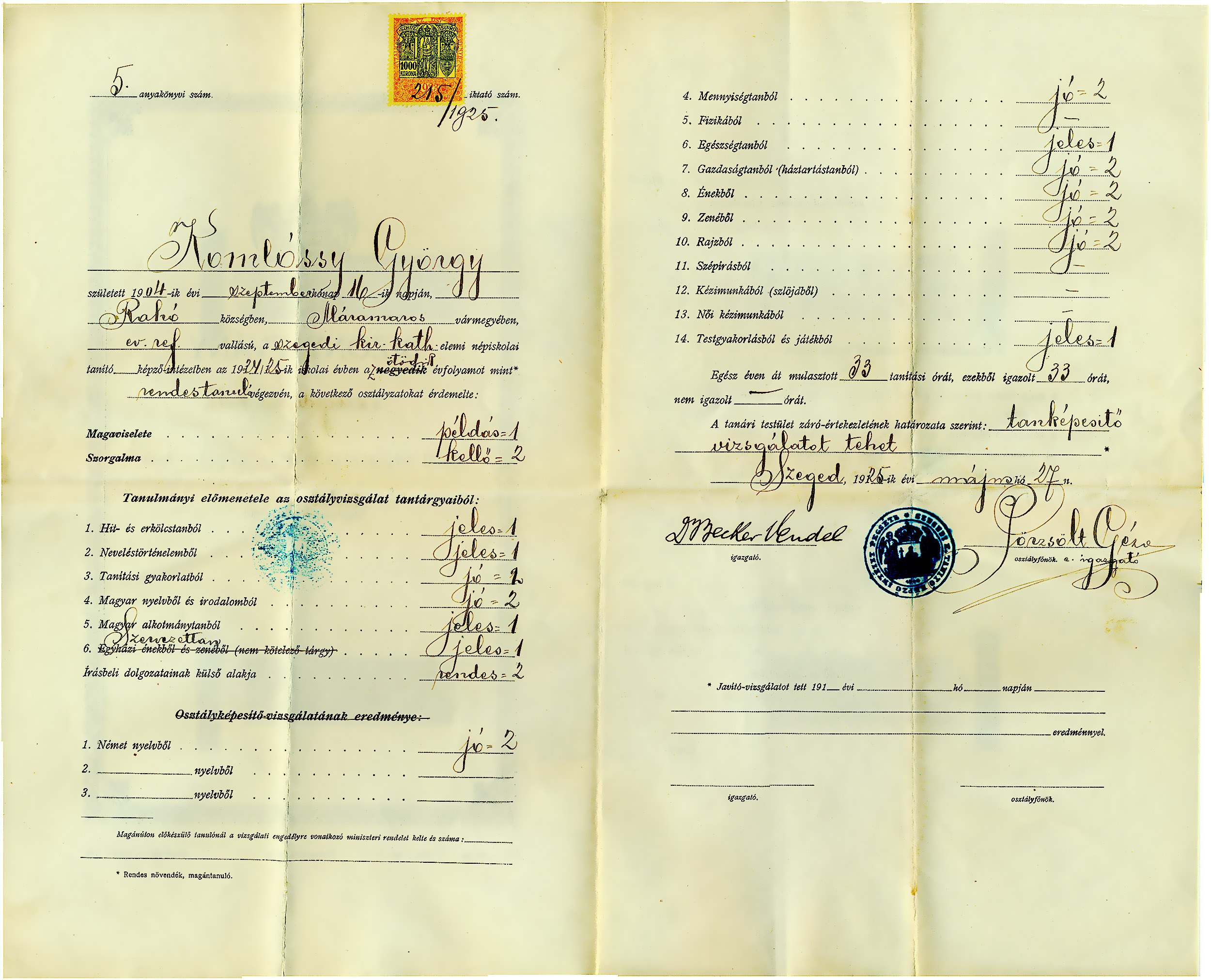 Komlóssy György népiskolai tanítóképzõi bizonyítványa1925-05-27Komlóssy György 1904 E022