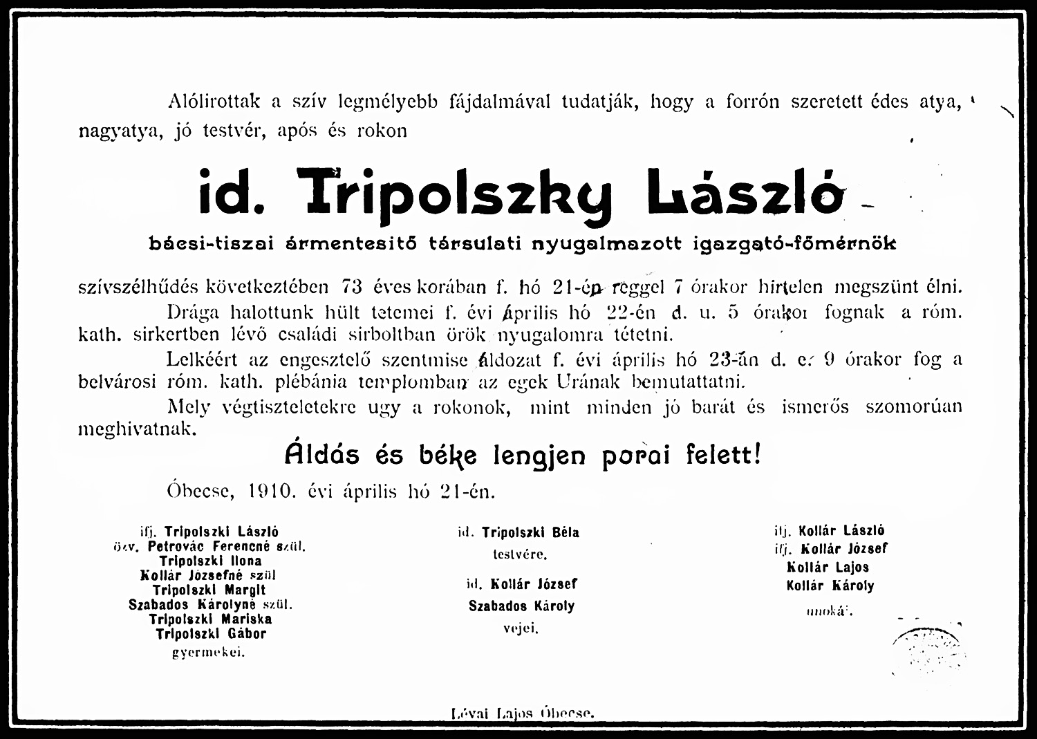 Tripolszky László gyászjelentése1910-04-21Komlóssy Ilona (Helén) 1846 D013