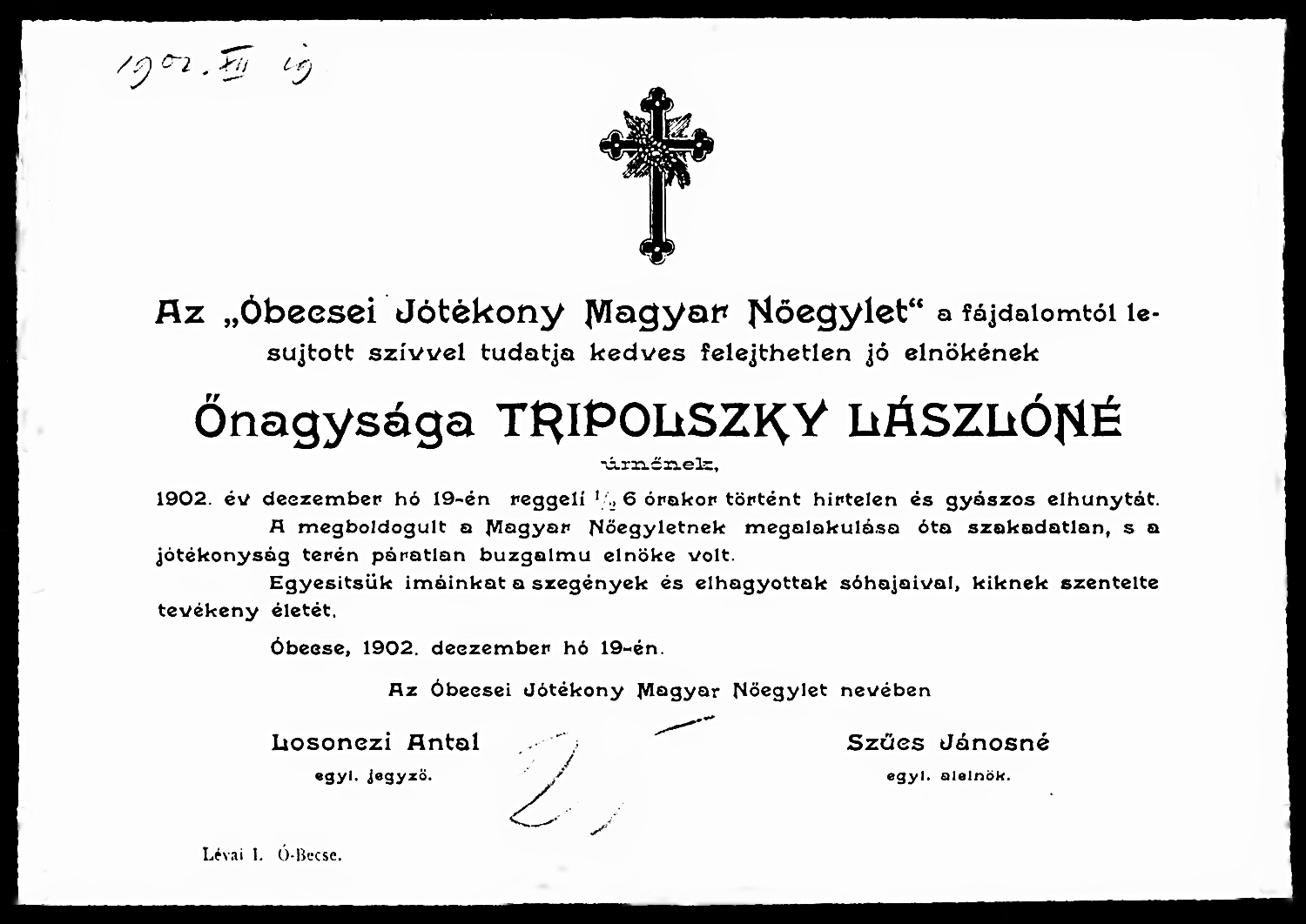 Komlóssy Helén (Tripolszkyné)nőegyleti gyászjelentése1902-12-19Komlóssy Ilona (Helén) 1846 D013
