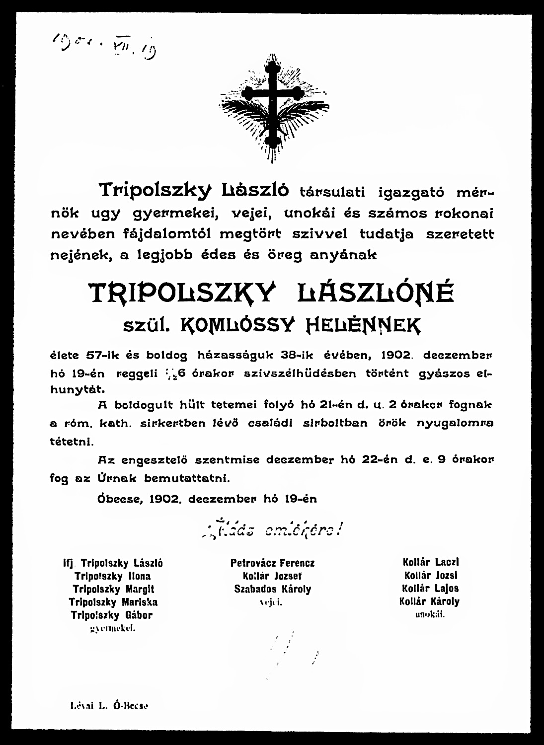 Komlóssy Helén (Tripolszkyné) gyászjelentése1902-12-19Komlóssy Ilona (Helén) 1846 D013