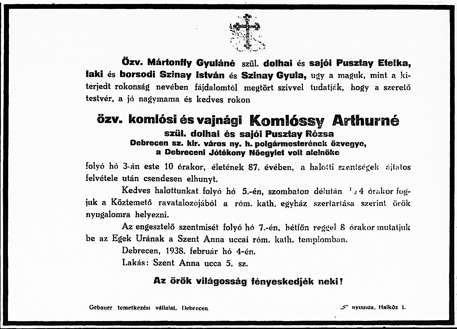 özv. Komlóssy Arturné sz. dolhai és sajói Pusztay Róza gyászjelentése1938-02-03Komlóssy Artúr 1848 D017