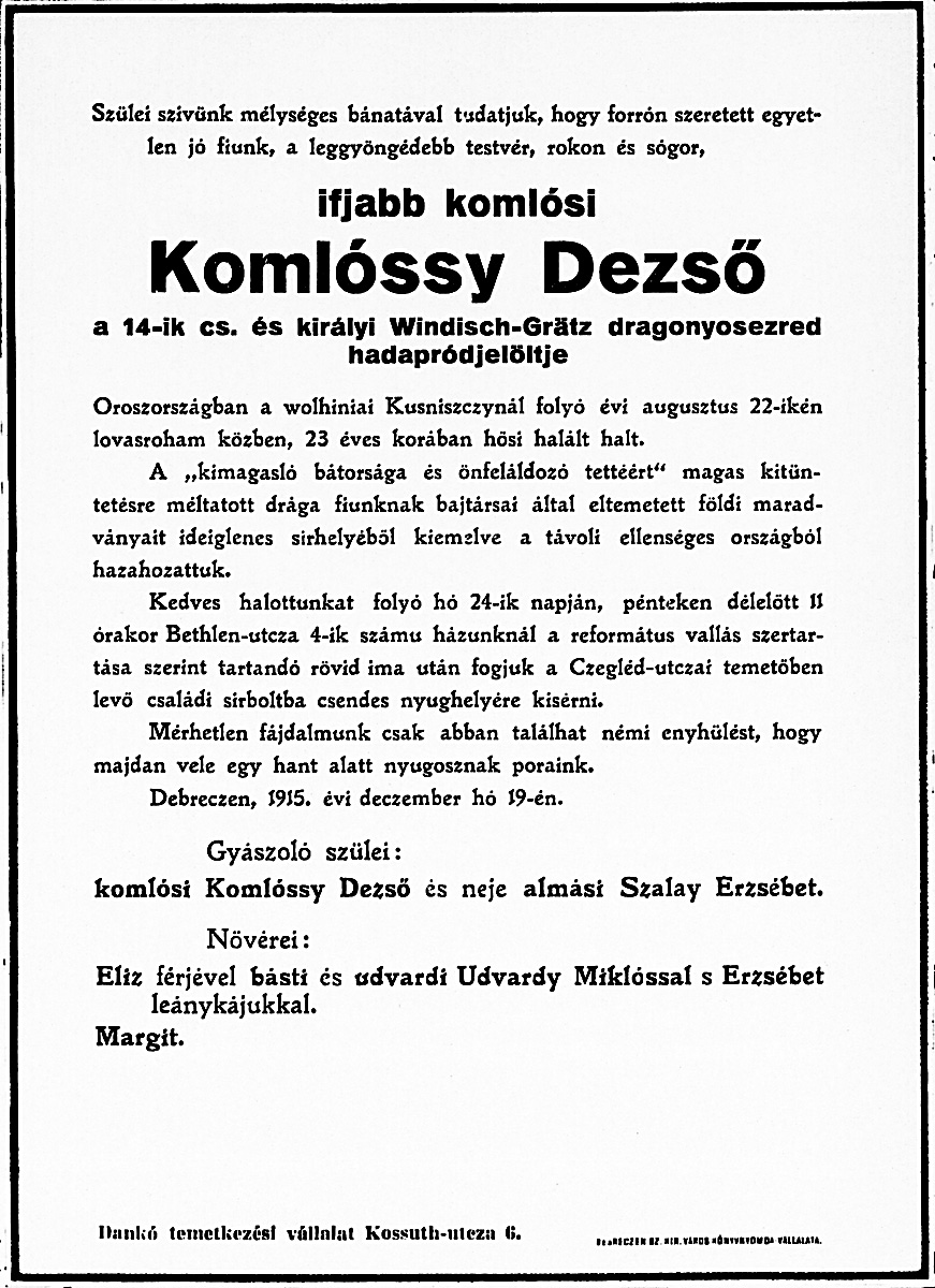 Komlóssy Dezsõ gyászjelentése1915-12-24Komlóssy Dezsõ 1892 D021