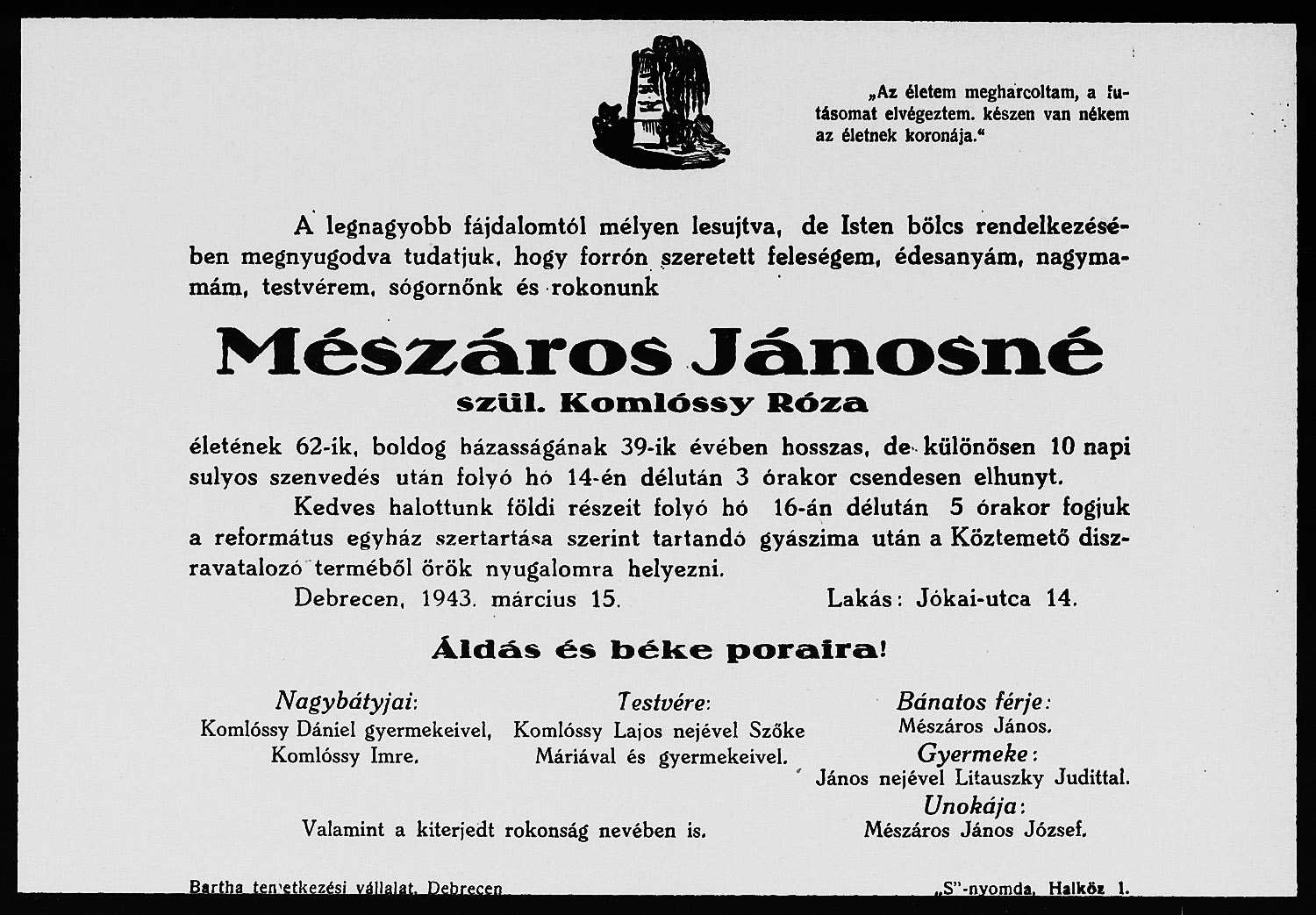 Komlóssy Róza (Mészáros Jánosné) gyászjelentése1943-03-14Komlóssy Róza 1881 U003