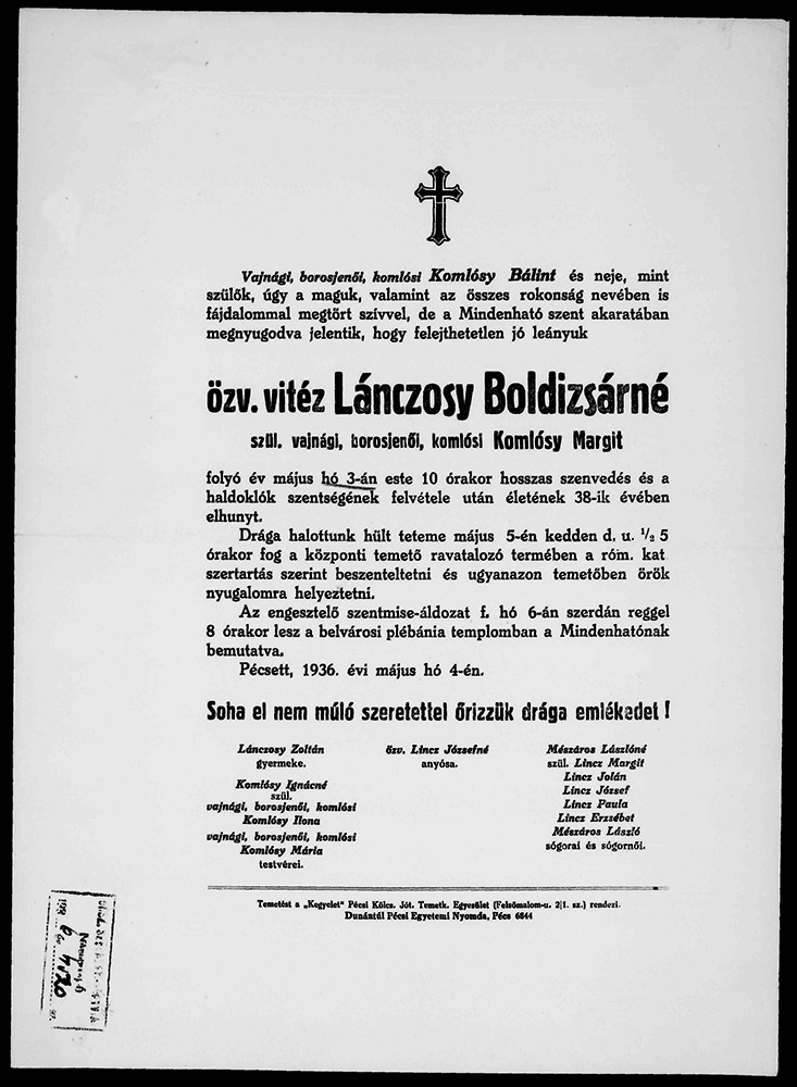 Komlósy Margit özv. vitéz Lánzosy Boldizsárné gyászjelentése1936-05-03Komlósy Margit 1897 F030
