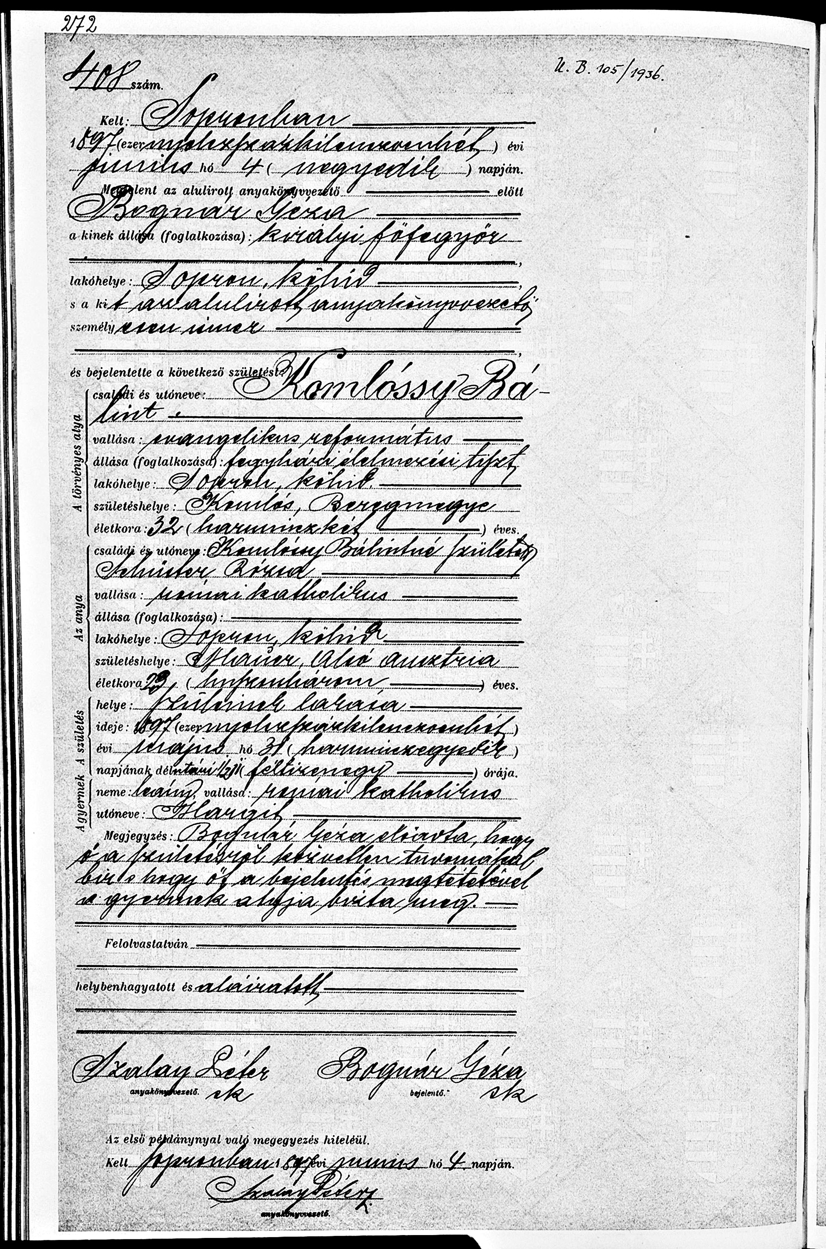 Margit F030 születési anyakönyvi bejegyzése1897-05-04Komlósy Margit 1897 F030
