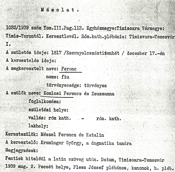 Komlóssy Ferenc keresztlevél másolat1939Komlóssy Ferenc 1817 G003