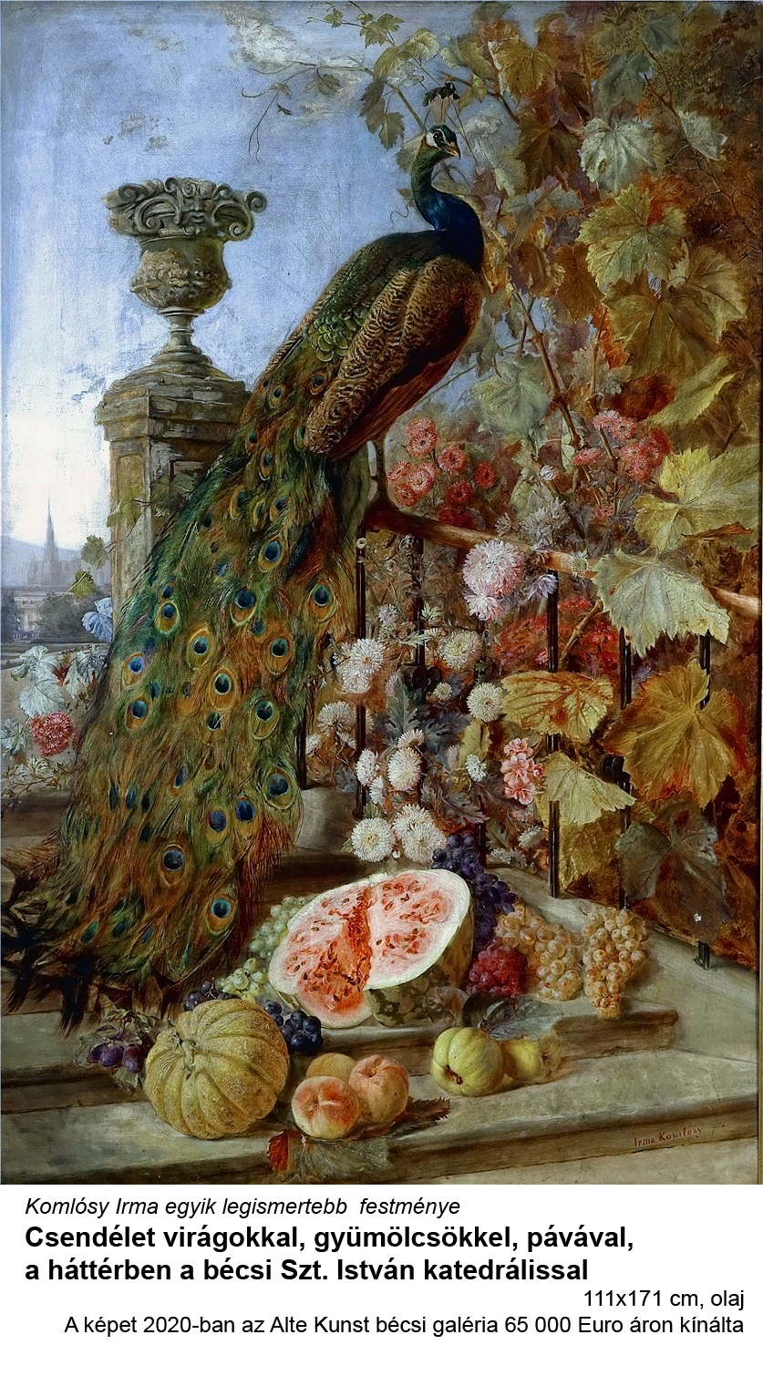 Csendélet virágokkal, gyümölcsökkel pávával, háttérben a bécsi Szt. István katedrálissalKomlóssy Irma 1850 G007
