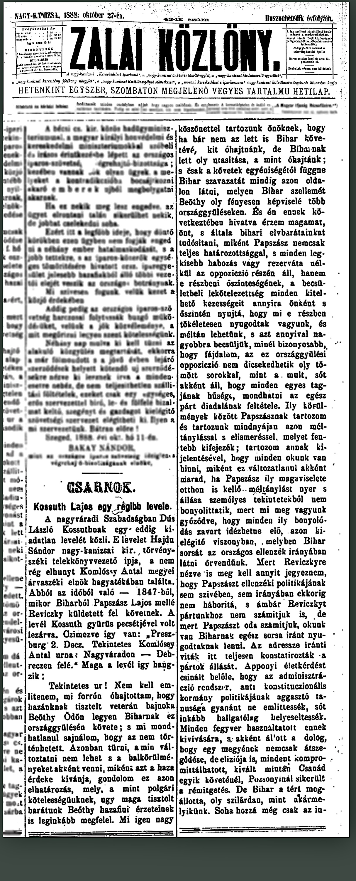 Kossuth levele Komlóssy Antalhoz1888-10-27Komlóssy Antal 1817 H004