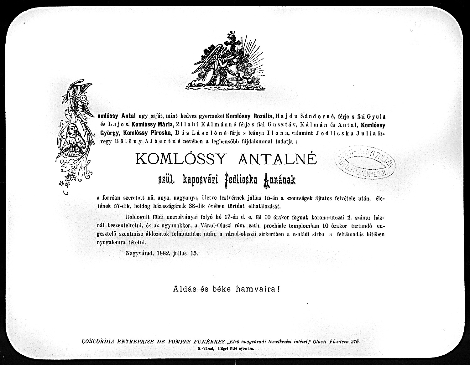 Jedlicska Anna, Komlóssy Antalné gyászjelentése1882-07-15Komlóssy Antal 1817 H004