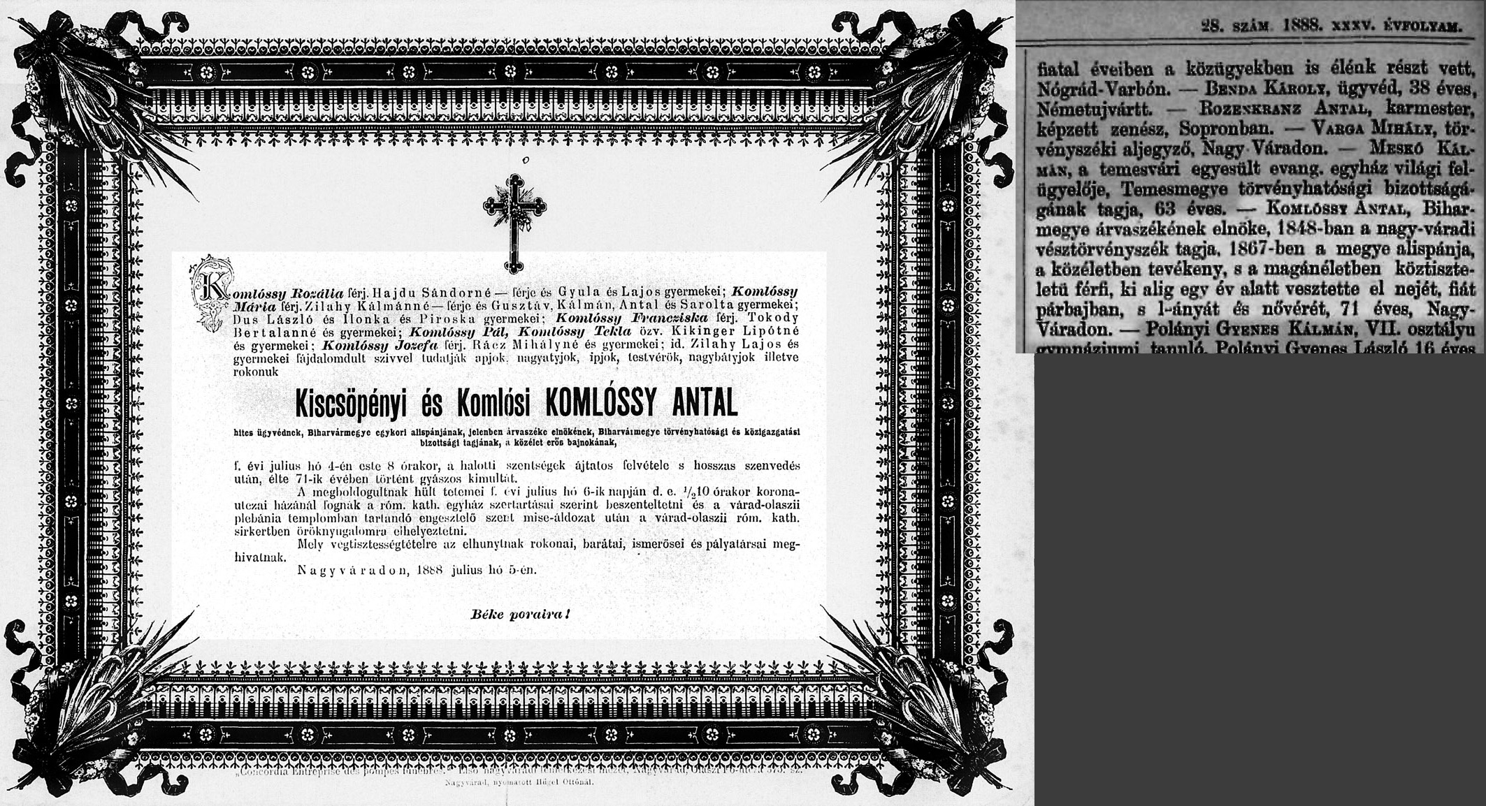 kiscsöpényi és komlósi Komlóssy Antal gyászjelentése1888-07-05Komlóssy Antal 1817 H004