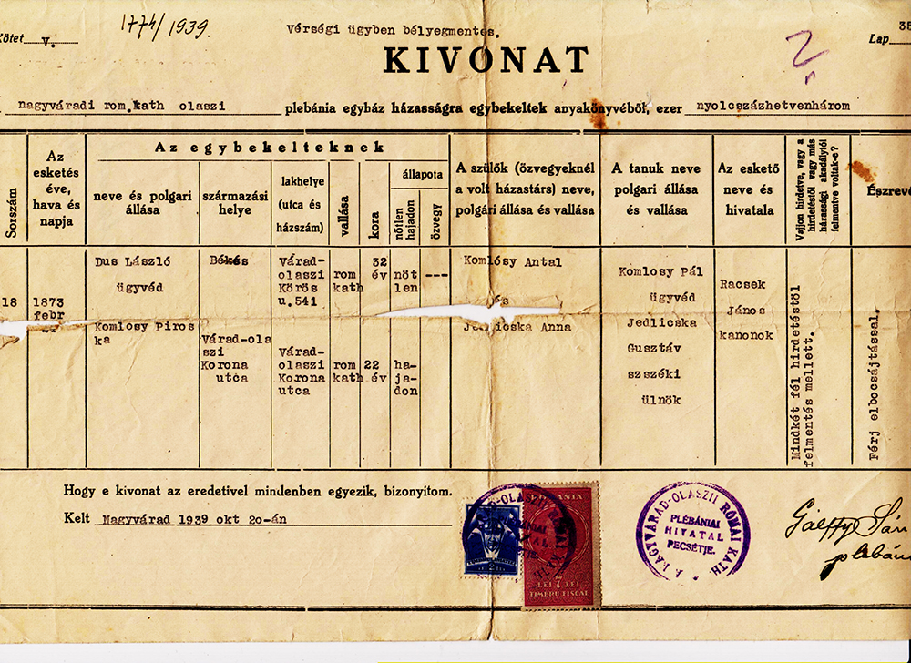 Komlósy Piroska és Dús László házasságlevele1873Komlóssy Piroska 1851 H016