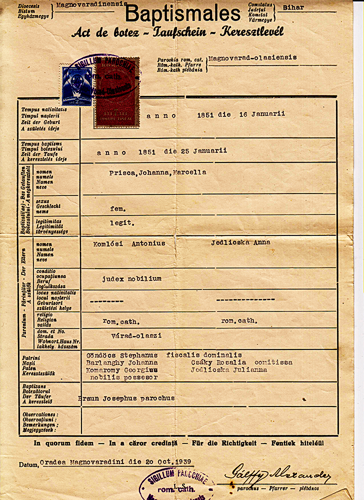 Komlosy Piroska (H0169) keresztlevele1851Komlóssy Piroska 1851 H016