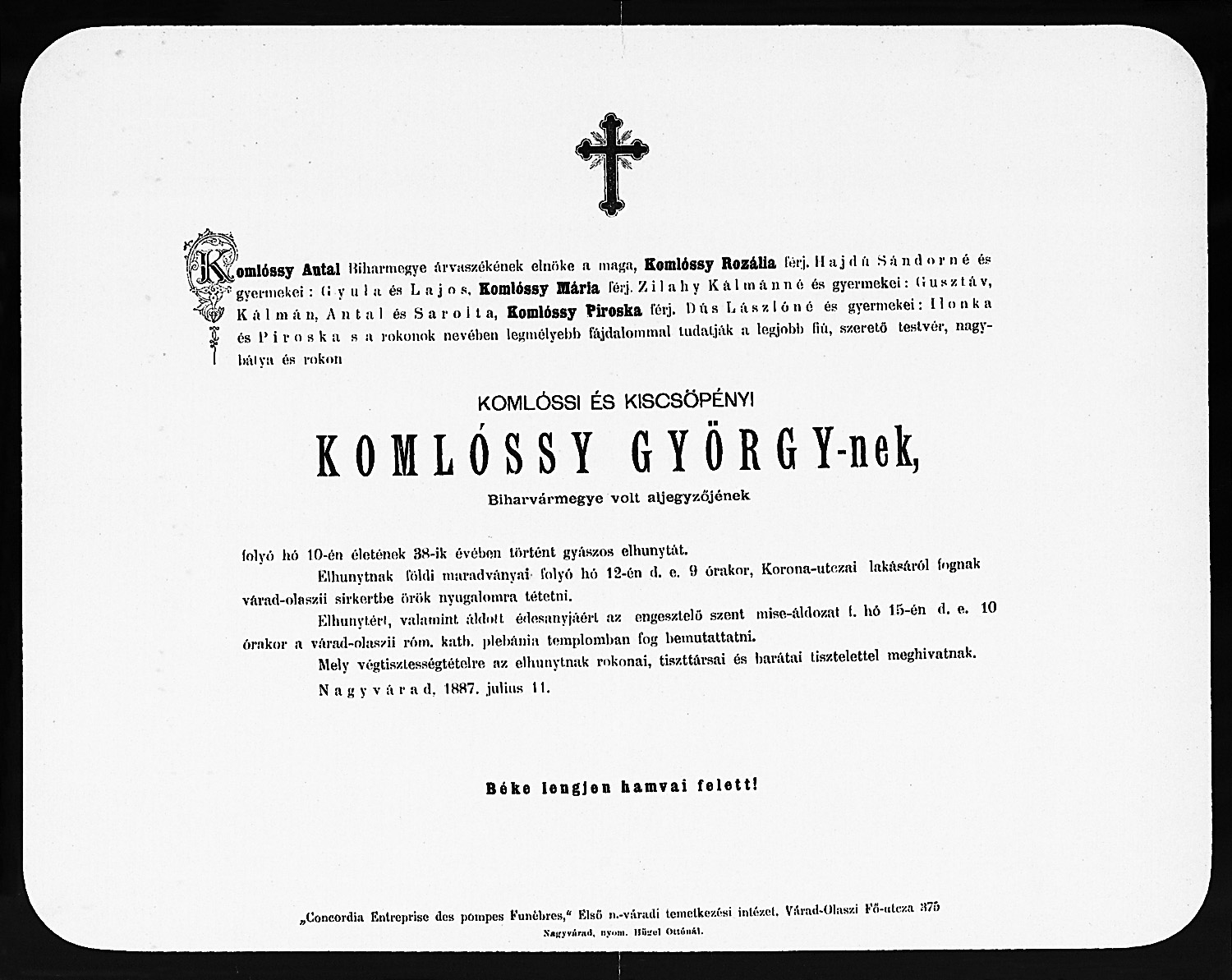 Komlóssy György gyászjelentése1887-07-11Komlóssy György 1848 H015