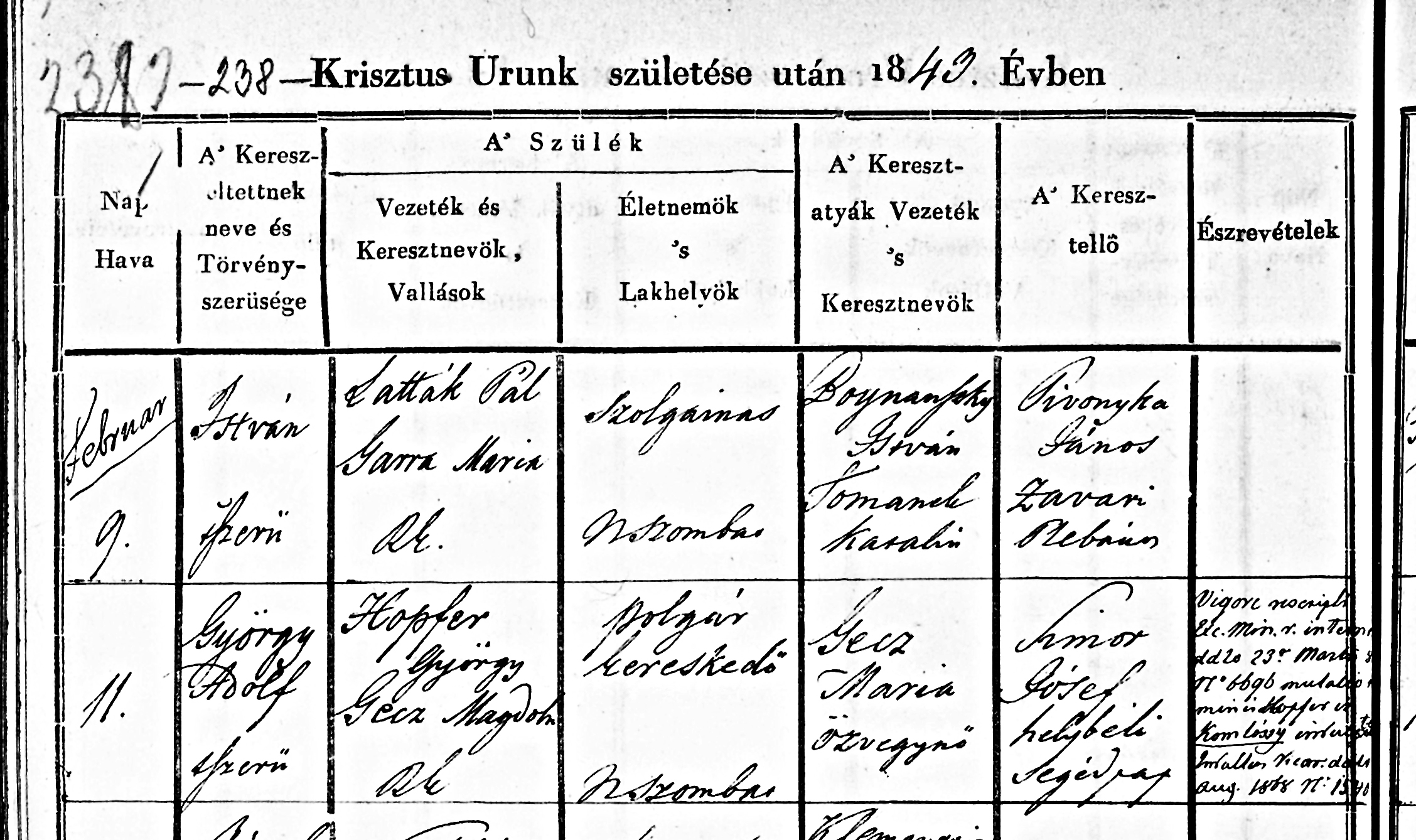 Komlóssy(Hopfer) Adolf születési anyakönyve, a névváltoztatás bejegyzésével.1843-02-11Komlóssy(Hopfer) Adolf 1843 J002