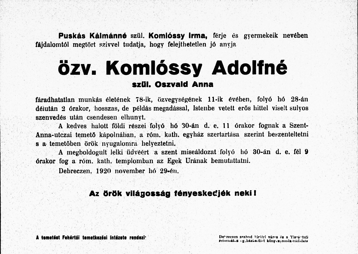 Oszvald Anna gyászjelentése1920-12-28Komlóssy(Hopfer) Adolf 1843 J002