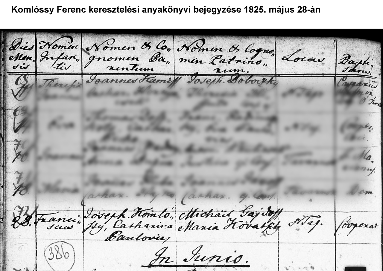 Komlóssy Ferenc születési anyakönyvi bejegyzése1825-05-28Komlósy Ferenc 1825 K002