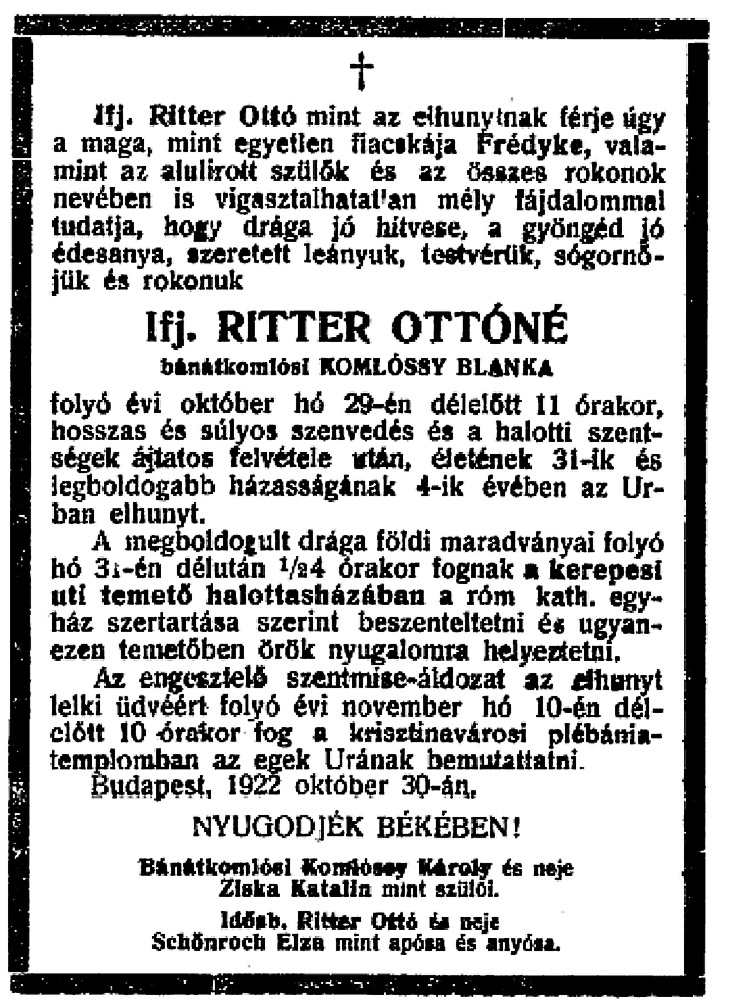 Ritter Ottóné Komlóssy Blanka halálhíre19221104Komlóssy Blanka 1892 K008