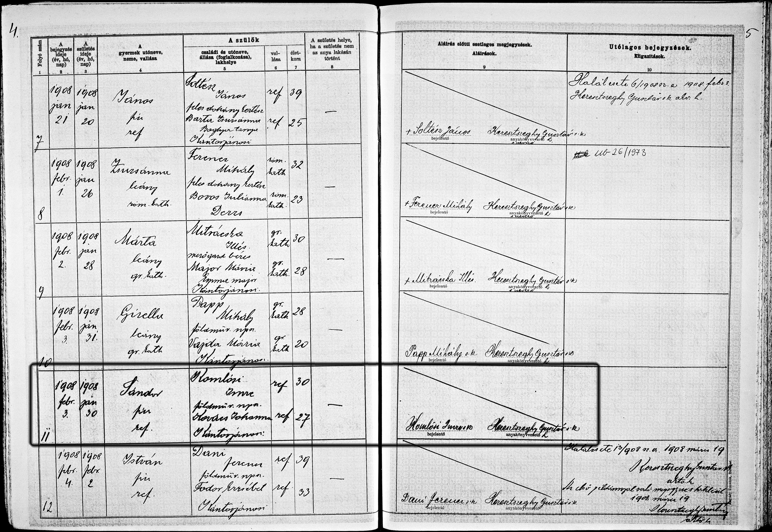 Sándor-L024 születési anyakönyvi bejegyzése1908-02-03Komlóssy Sándor 1908 L024
