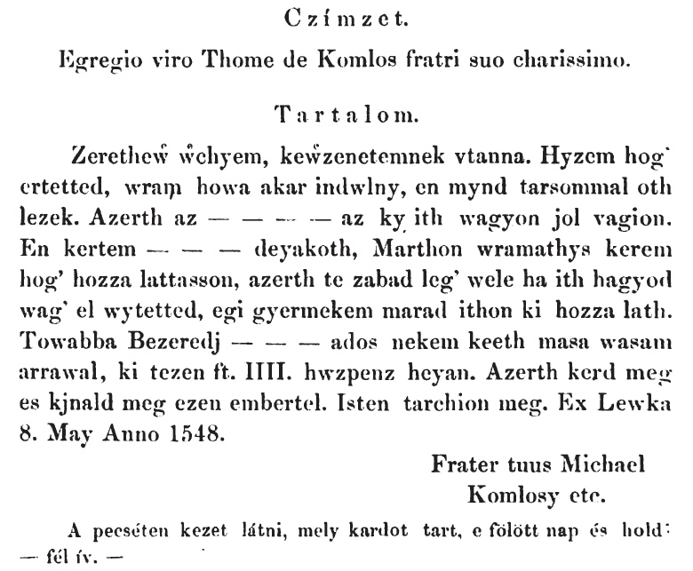 Komlóssy Mihály öccséhez Tamáshoz Magyar Levelestár 44. levél1548-05-08Komlóssy Mihály ~1490 A085